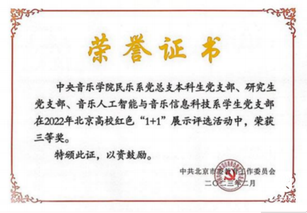 为学习贯彻党的二十大精神和习近平总书记在庆祝中国共产主义青年团成立100周年大会上的重要讲话精神,扎实推进教育部“青春献礼二十大 强国有我新征程 ”迎接学习宣传党的二十大主题宣传教育活动和北京教育系统“请党放心 强国有我 ”主题教育活动,教育引导大学生自觉将“小我 ”正青春融入“大我 ”新时代,市委教育工委自2022年6月份以来组织开展了北京高校红色“1+1”活动。2023年2月经过支部申报、学校推荐、专家初评、现场复评确定等环节,开云kaiyun官方网站民乐系党总支本科生党支部、研究生党支部、音乐人工智能与音乐信息科技系学生党支部获得三等奖。