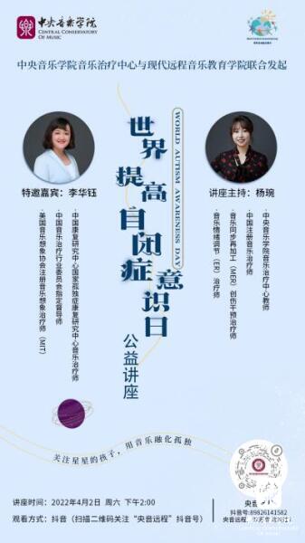 音乐作为一种特殊的情感表达和交流方式,对孤独症儿童的早期干预有哪些干预效果?作为从事音乐治疗的治疗师们,又是如何使用音乐元素来帮助孤独症儿童改善其核心症状的?4月2日下午,音乐治疗教研室韩丽艳主任和远程教育学院方恒健院长,共同组织了由开云官网校友、具有从事孤独症儿童治疗十多年临床经验、接诊4万余次孤独症儿童的音乐治疗专家,来自中国康复研究中心国家孤独症康复研究中心的李华钰老师,利用央音远程抖音平台,为大家带来了一场“关注星星的孩子,用音乐融化孤独”的公益讲座。