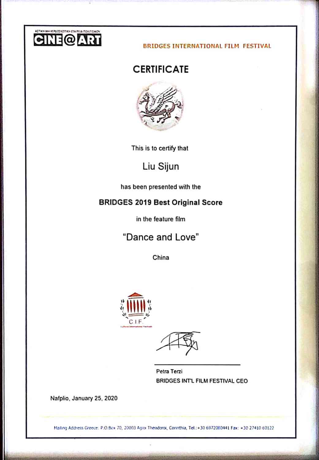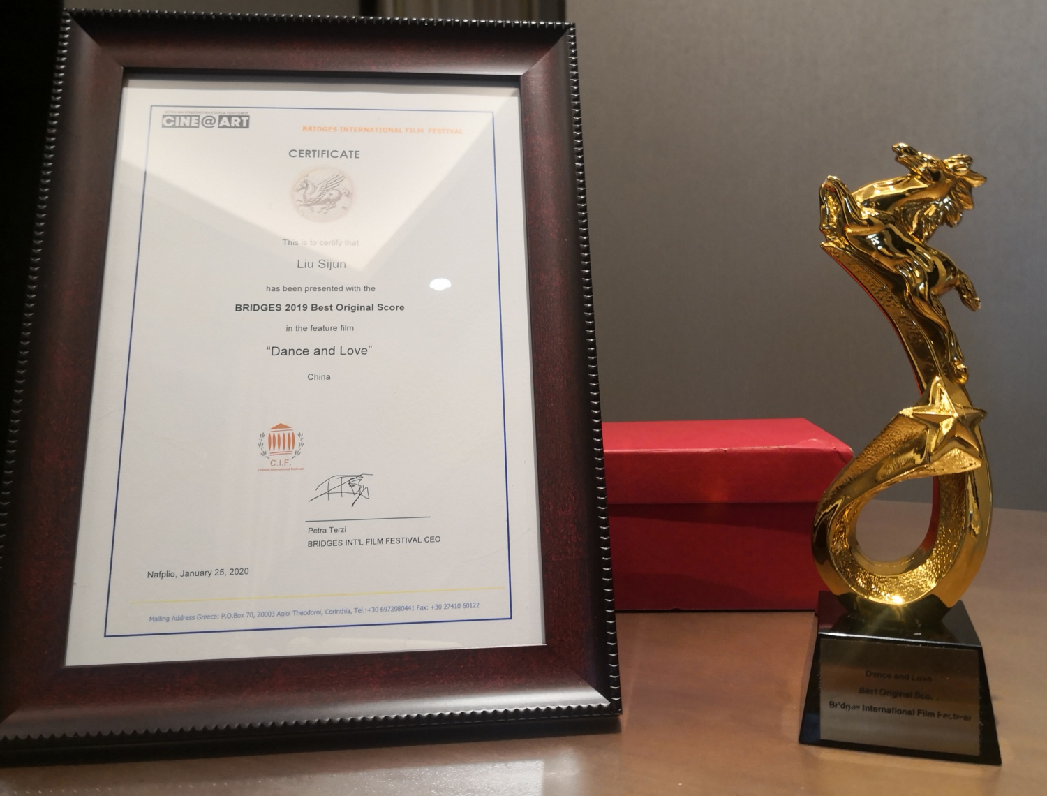 该片于2019年报名参加希腊布里其斯电影节,在2000余部影片遴选中脱颖而出,入围主竞赛单元,音乐提名奖共三人,另两位是匈牙利和日本作曲家,最终在1月25日的颁奖中《舞爱》获得了最佳音乐奖。由于疫情的原因,奖杯和证书终于在几个月之后辗转寄到国内,是一份迟来的喜讯。