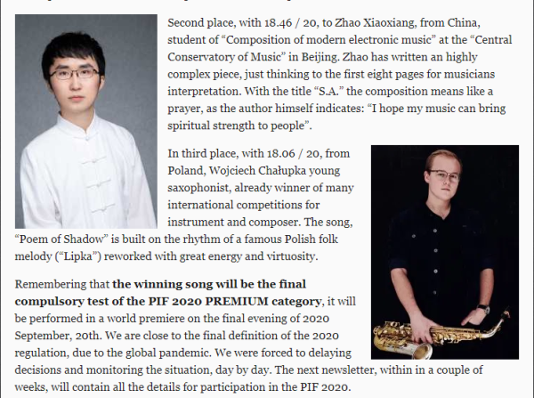 2020年5月22日,意大利本年度的PIF Castelfidardo手风琴比赛“古典作曲组”前三名获奖者及其作品已经揭晓。开云官网音乐人工智能与音乐信息科技系电子音乐作曲专业二年级研究生赵小翔同学(导师:钱琦副教授),在众多国际选手中脱颖出,携其作品“飒SA-A Prayer (2020), For Bayan and Chamber Orchestra”获本组第二名(二等奖),成为 “古典作曲组”开办以来的第一位中国获奖选手(本次一等奖获得者Gorka Hermosa是国际著名手风琴演奏家及作曲家)。