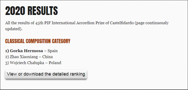 PIF Castelfidardo属国际手风琴界一流赛事,已有45年历史。为鼓励新作品创作而开设的“古典作曲组”,无年龄、国籍限制,其评委会主席Friedrich Lips是俄罗斯最为著名的音乐家,评审团成员均为来自世界各地的杰出作曲家、演奏家、指挥家,有:Franck Angelis (France), Livio Bollani (Italy), Antonio Cericola (Italy), Bete Ilin (Macedonia)等。严格的评审结果如下: