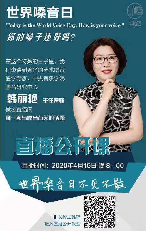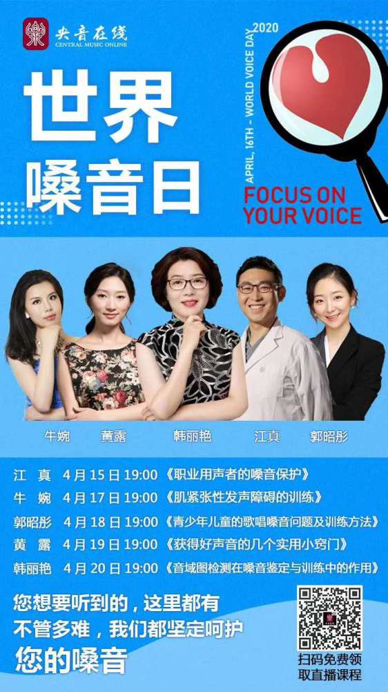 我们是在全球抗“疫”、大家居家隔离的特殊情况下,迎来了2020年的“世界嗓音日”,今年的主题是“关注你的嗓音”(Focus on Your Voice)。疫情发生后,我们看到有些人因为着急上火而出现声音嘶哑的情况,也看到因为对疫情不够清晰、准确地表达带给社会的危害。随着全民抗“疫”号角的吹响,抗“疫”措施的落实,涌现出许多感人至深的画面和催人泪下的故事。在这样的抗疫背景下,《天使的身影》(袁英词、张千一曲)、《我们》(李小兵词曲)、《致敬钟南山》(陈先义作)等一批优秀作品的问世,让我们有机会用语言和歌声表达对直言者和逆行而上的医务工作者们的敬意,歌颂“舍小家为大家”的牺牲精神。让歌声抚慰人们的心灵,鼓舞人们战胜困难的勇气和信心,这不也正好体现出“世界嗓音日”发起者们的美好初心吗?正如俞峰院长所说:“面对疫情我们有太多的话要说,有太多的感受要表达”。