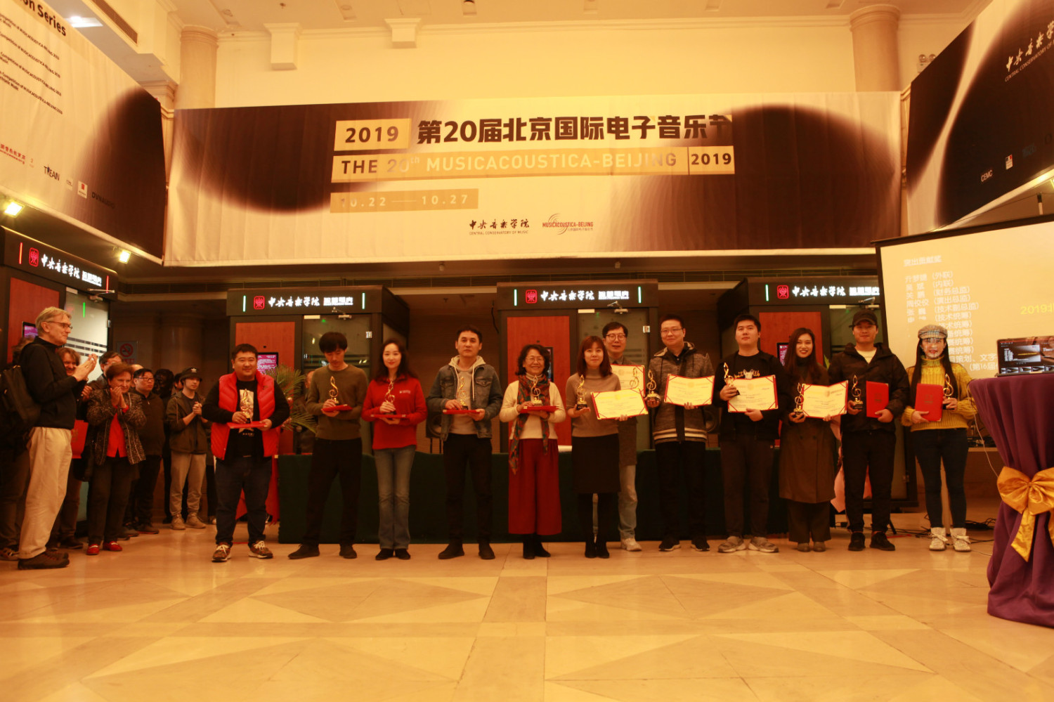 北京国际电子音乐节是国际电子音乐学界的年度盛会,也是“大家的事情大家办”,“众人拾柴火焰高”协同创新的集中体现。音乐节闭幕式前举行了颁奖典礼,在为第16届北京国际电子音乐作曲比赛获奖的40位获奖者颁奖后,还为本届音乐节做出了突出贡献的、来自开云kaiyun官方网站和全国各地音乐艺术院校的中国电子音乐学会会员师生举行了隆重的颁奖仪式。他们是:音乐节外联统筹亓梦婕,内联统筹吴斌,财务总监关鹏,演出总监周佼佼,技术副总监张巍、技术统筹申坤、于得智,设备统筹卓佳宾,比赛统筹时昊、刘雅秋,比赛GF打分系统研发巩子晗、冯金硕和项目策划王海旭颁发了突出贡献奖;为黄琦英、李妍蔚、宋禹、宋超凡、王炳棠、林明辉、朱梓元、孙佳瑞、文乔月、刘沛鑫和米文博颁发了音乐节嘉奖;为中国传媒大学音乐与录音艺术学院王铉、山西传媒学院申坤、山东农业大学艺术学院孔雪颁发了最佳组织奖;为战略合作伙伴代表陈飞女士和邓凤女士颁发了特别贡献奖,为本届音乐节的圆满闭幕划上了完美的句号。