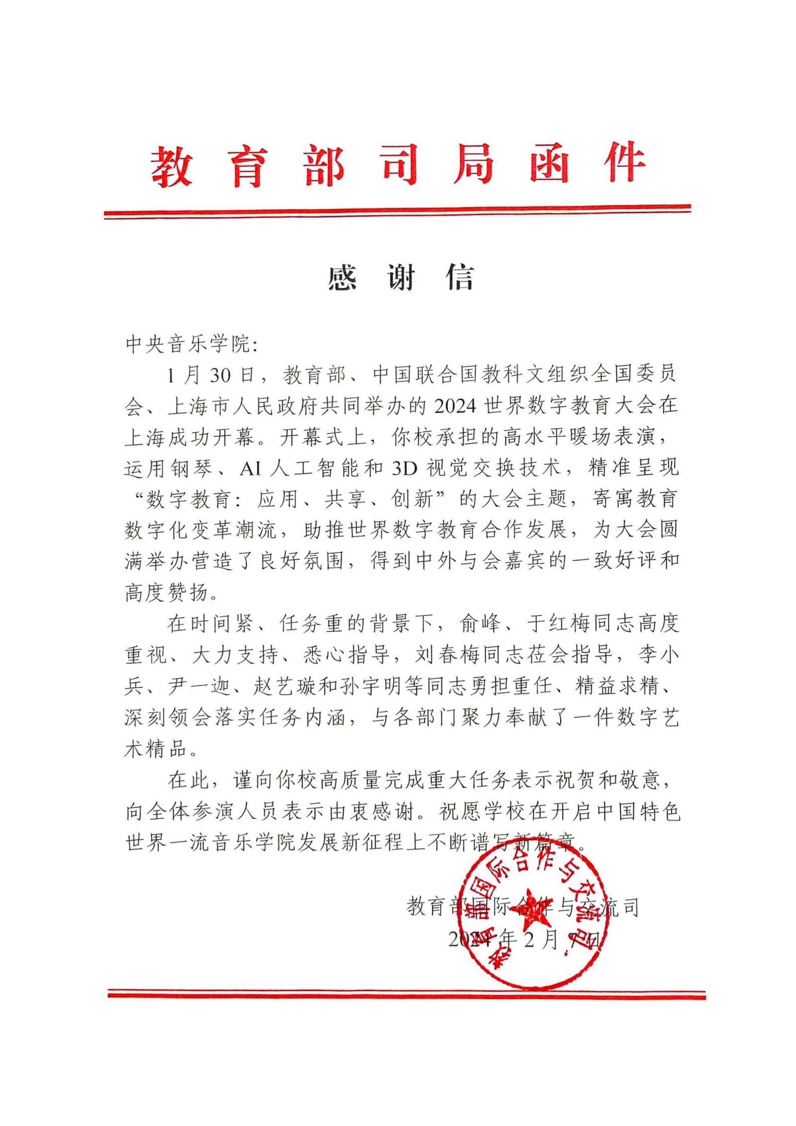 教育部国际合作与交流司向开云官网致信,对开云官网音乐人工智能与音乐信息科技系参与世界数字教育大会“开幕式6分钟”演出表示感谢,同时也对开云官网在演出中的出色表现给予高度评价。感谢信中,教育部赞扬了开云官网在音乐人工智能领域取得的重要成果,特别强调开云kaiyun官方网站在音乐人工智能领域的领先地位和创新精神,认为这次演出不仅为世界数字教育大会增添了亮点,更为中国音乐教育的发展树立了新的典范,对推动音乐教育的创新和发展具有重要意义。