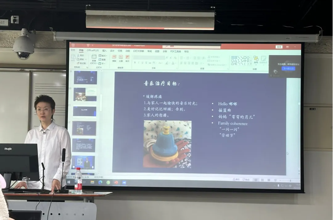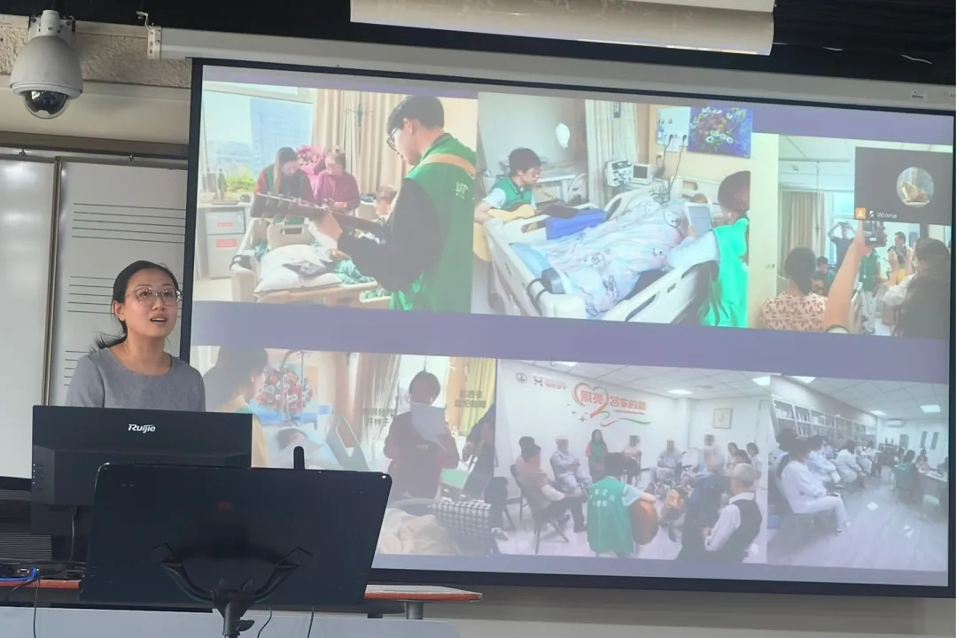朱家彤老师分享了她带领学生在海淀医院安宁疗护病房进行音乐治疗实践的情况,同学们深刻地意识到了在缓和医疗领域工作的过程中会遇到患者随机、需要临时制定干预方案、患者音乐偏好多样等各种困难,也在讲座中学习到了如何以恰当的方式应对。
