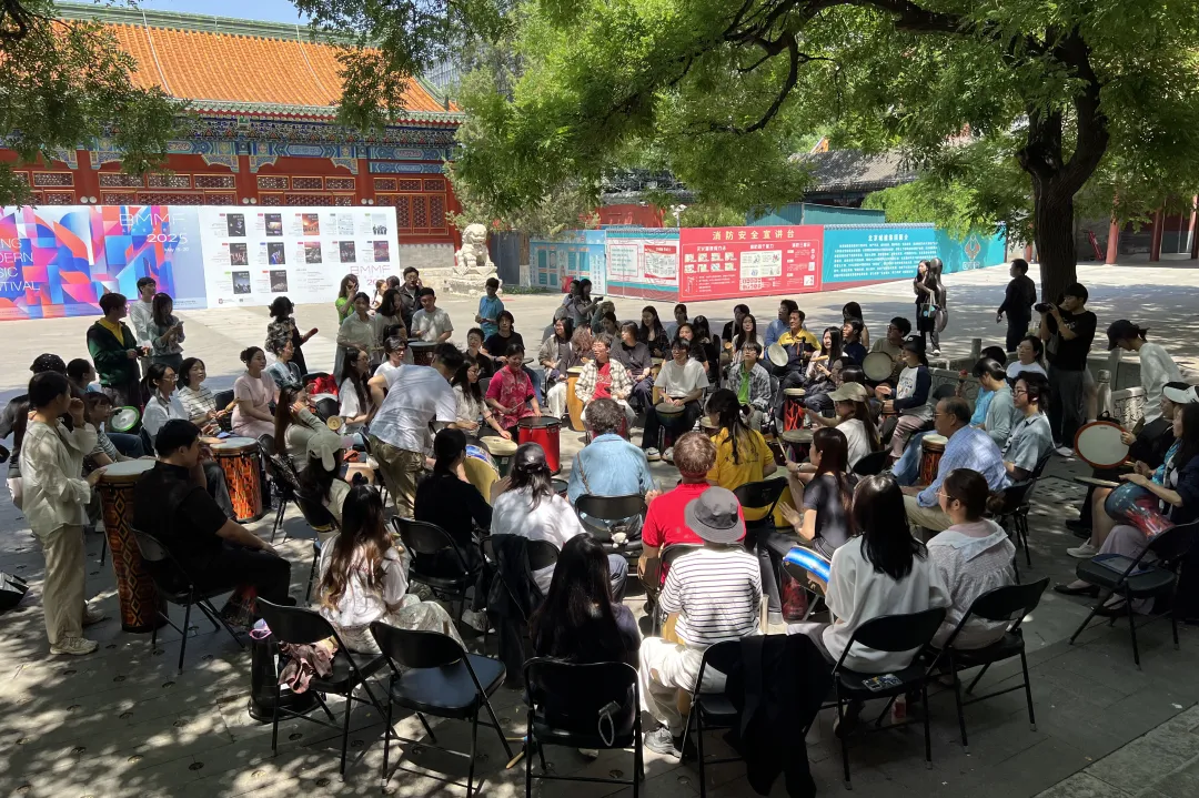 活动伊始,不少参与者带着些许好奇和试探,动作略显拘束地演奏着手边的乐器。随后,在Arthur Hull充满感染力的笑容和富有魔力的手势引导下,大家很快放下顾虑,身体不自觉地随着节奏摇摆。紧绷的肩膀放松了,低垂的头颅抬起了,专注的目光紧紧追随着引导者的每一个动作。