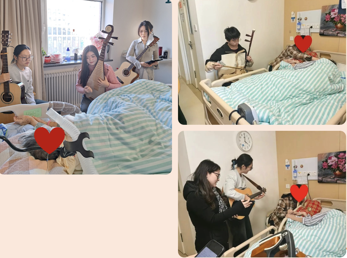 “在进行音乐活动的过程中,当我看到病床上的人们静静聆听音乐,或是跟随音乐演奏乐器、轻声哼唱时,我心中无比动容。我可以看到,那些熟悉的歌曲或简单的乐器演奏,带给患者一定程度的放松,我也希望我们的音乐能带给他们心理上的安宁。因为也是第一次做安宁疗护方面的音乐活动,当我进入病房的时候,我其实有点不安,因为有点害怕看到那些饱受病痛折磨的人们,在面对脆弱的生命时甚至会有些无力感。但当我们真的唱起歌时,我感到音乐的能量是巨大的,能够带给人们慰藉。同时,我也注意到家属在治疗中的变化。音乐为他们提供了一种情感出口,让他们在陪伴患者的同时找到一种释放的方式。当看到家属握着患者的手静静聆听着哭泣时,我心中也五味杂陈。但同时,我也能感受到这种共同参与的过程似乎让他们之间的联系更加深刻。虽然这一次的音乐活动无法改变什么现实,但我希望能够给患者们带来人生最后阶段的美好回忆。”(2023级音乐治疗专业学生常芃芃)