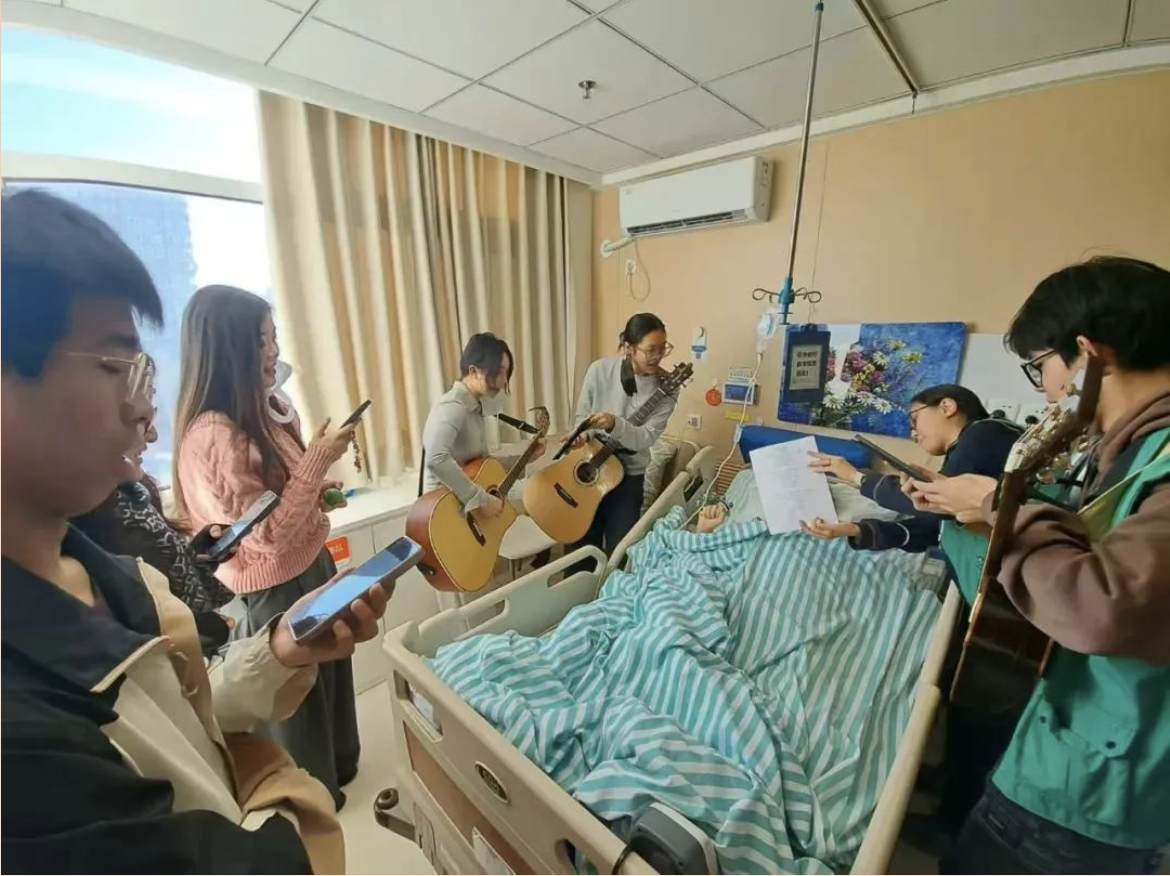 服务的第四位患者是位叔叔,他得知师生们要来时,特意坐起来准备与大家一起享受音乐。师生们进病房时,叔叔已经坐在床上,面带微笑等待大家了。叔叔十分喜欢草原歌曲,在学生的伴奏下,他全情投入,与大家一起演唱了《美丽的草原我的家》和《可可托海的牧羊人》,并主动请求演唱一首《萱草花》。随着歌声和轻柔吉他的和鸣,叔叔几度哽咽。他带着满怀感激的心情,分享道:“非常感谢你们的陪伴,世界如此美好,音乐如此美好,有人来与我分享这些美好,我感到非常激动。”