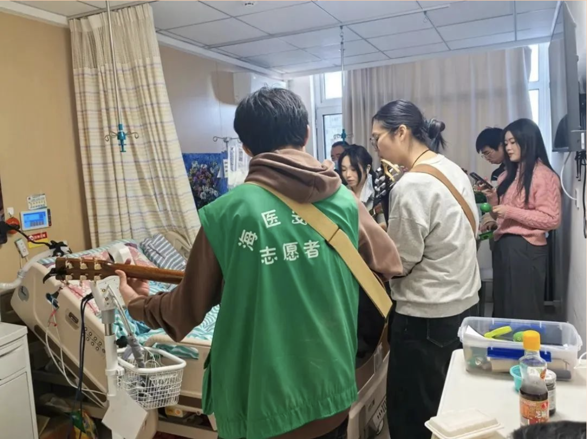 第一位接受服务的爷爷躺在床上,看到师生们进来时,脸上露出了温暖的笑容。他的认知和语言清晰,可以与大家简单交流。爷爷在确认了大家前来的目的后,点了几首自己喜欢的歌曲:《月亮代表我的心》、《美丽的草原我的家》、《红梅花儿开》。在熟悉的旋律中,他还用摇铃为歌曲伴奏,并与大家一起歌唱。唱完后,爷爷又听了一段琵琶独奏《春雨》。随着音符流淌,爷爷分享起了他对这些歌曲的回忆——有的谈到了歌曲背后的故事,有的则是与他个人生活息息相关的点滴。每一句话语,都如同一个温暖的故事,在这片安静的病房里悄然传递。