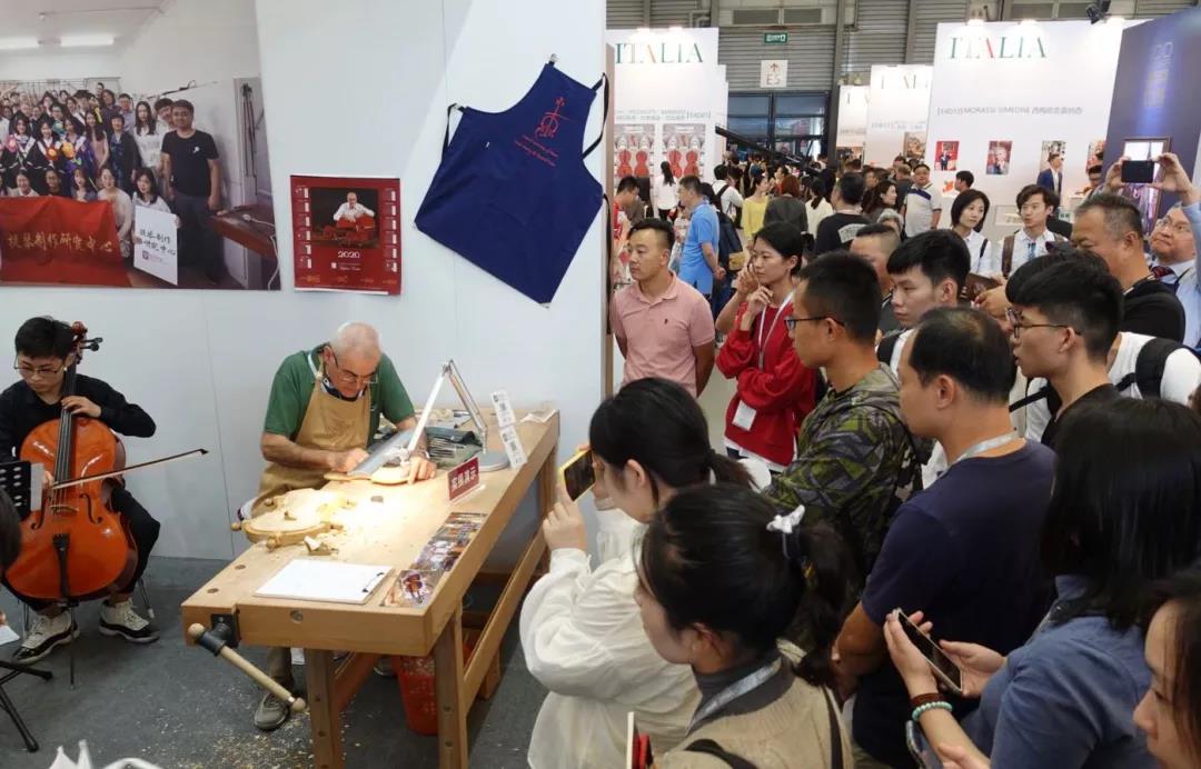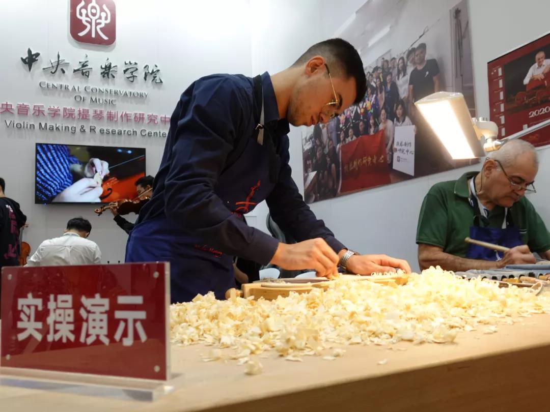 意大利克雷莫纳的著名提琴制作大师Stefano Conia、中心副主任高彤彤教授、逯翔老师、赵祎老师、潘东昊老师、意大利交换生Giulio Morassi(世界提琴制作巨匠Gio Batta Morassi的长孙)以及参加展会的每位同学,轮流为观展者们奉上精彩绝伦的提琴制作实操展示。刨花四射的展台为观展者一揭提琴诞生的神秘面纱。方寸之间的妙手创造之功,成为全馆最为亮丽的一道风景。