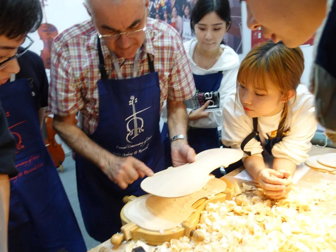 Stefano Conia大师利用现场展台,不失时机地为中心学生开展现场大师制作课程,指导每位参展学生制琴,既向观展者展示了制作,又为中心学生开展了大师课教学。