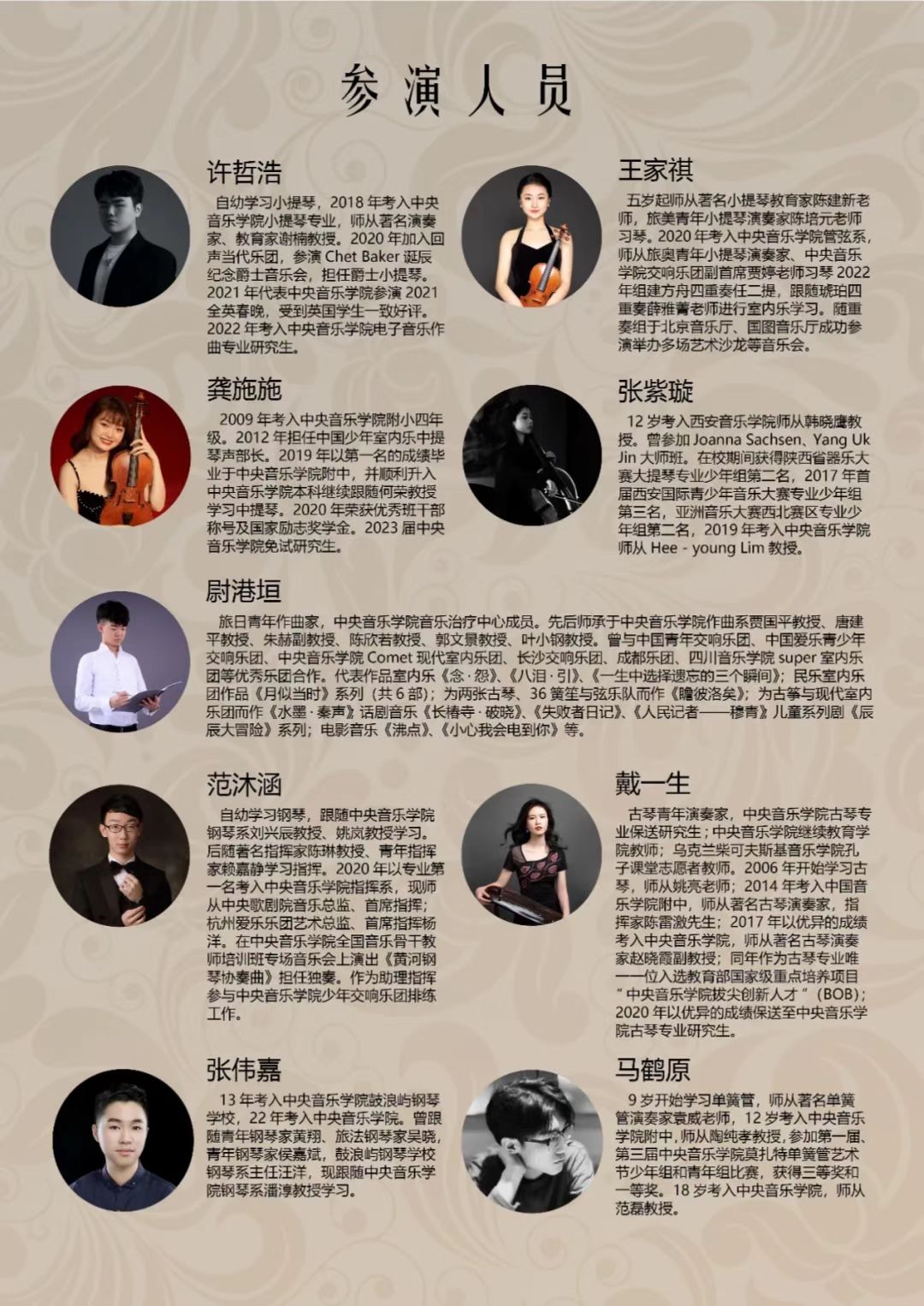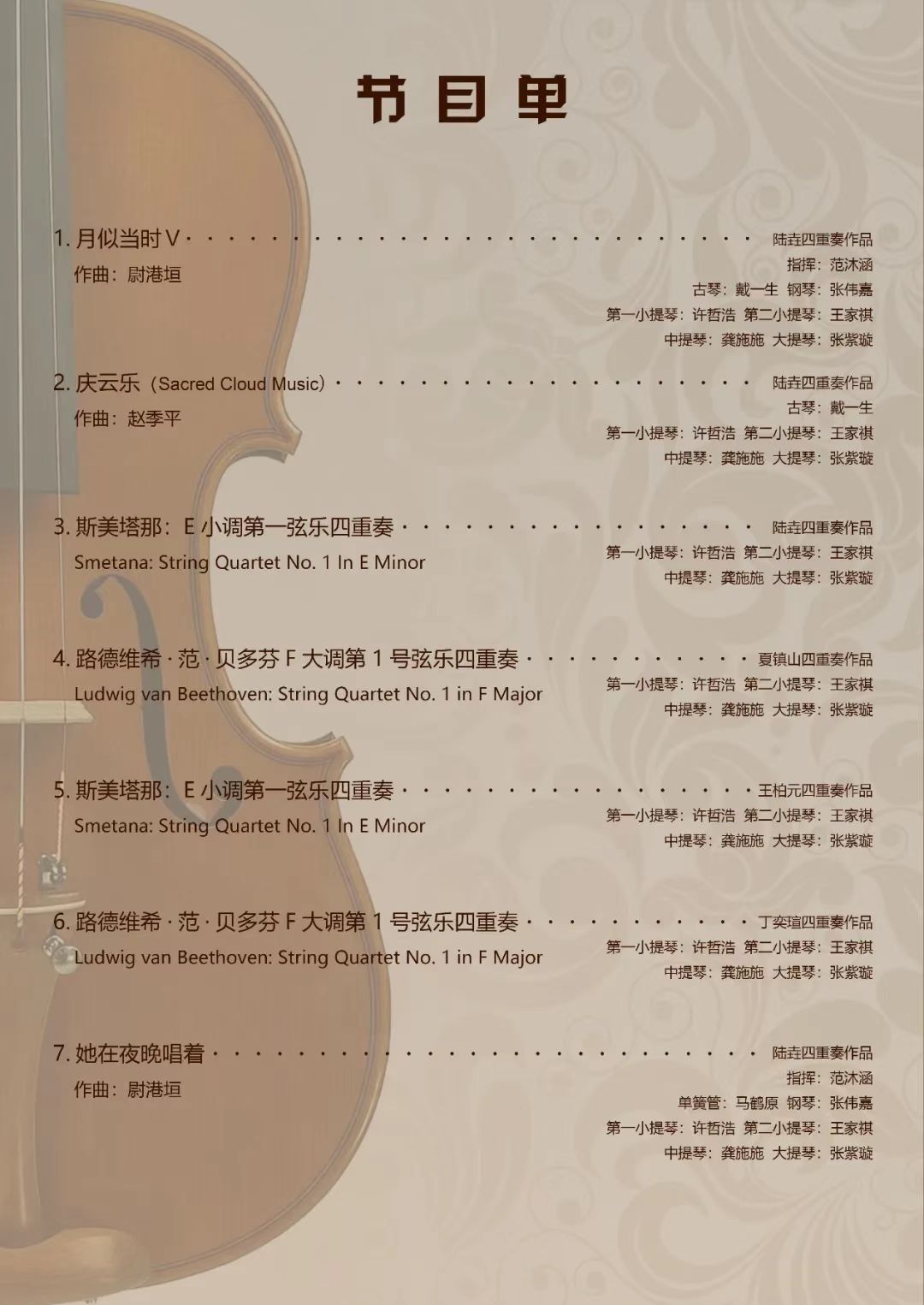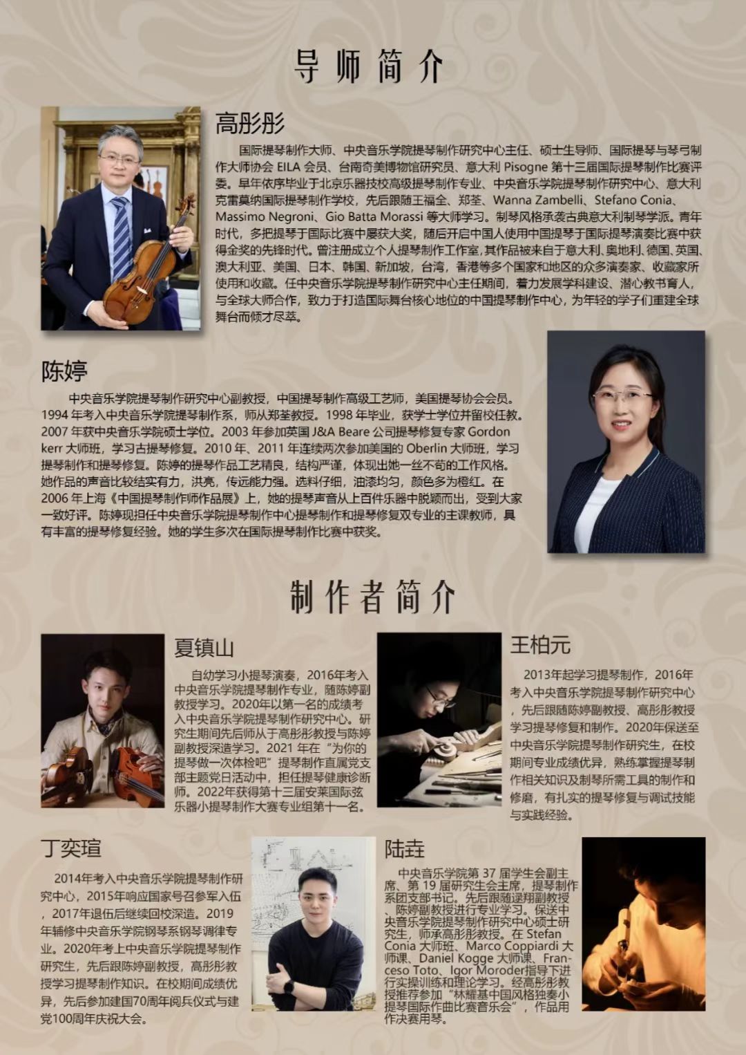 此次音乐会的提琴全部出自提琴制作硕士毕业生之手,是他们在老师的指导下,于校内制作完成的。本次音乐会将使用每位毕业生的一套四重奏提琴,分别为您上演一套四重奏套曲。