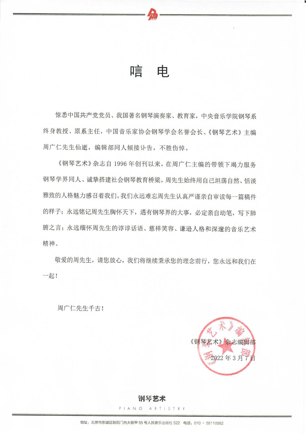《钢琴艺术》杂志致唁电 悼念周广仁先生