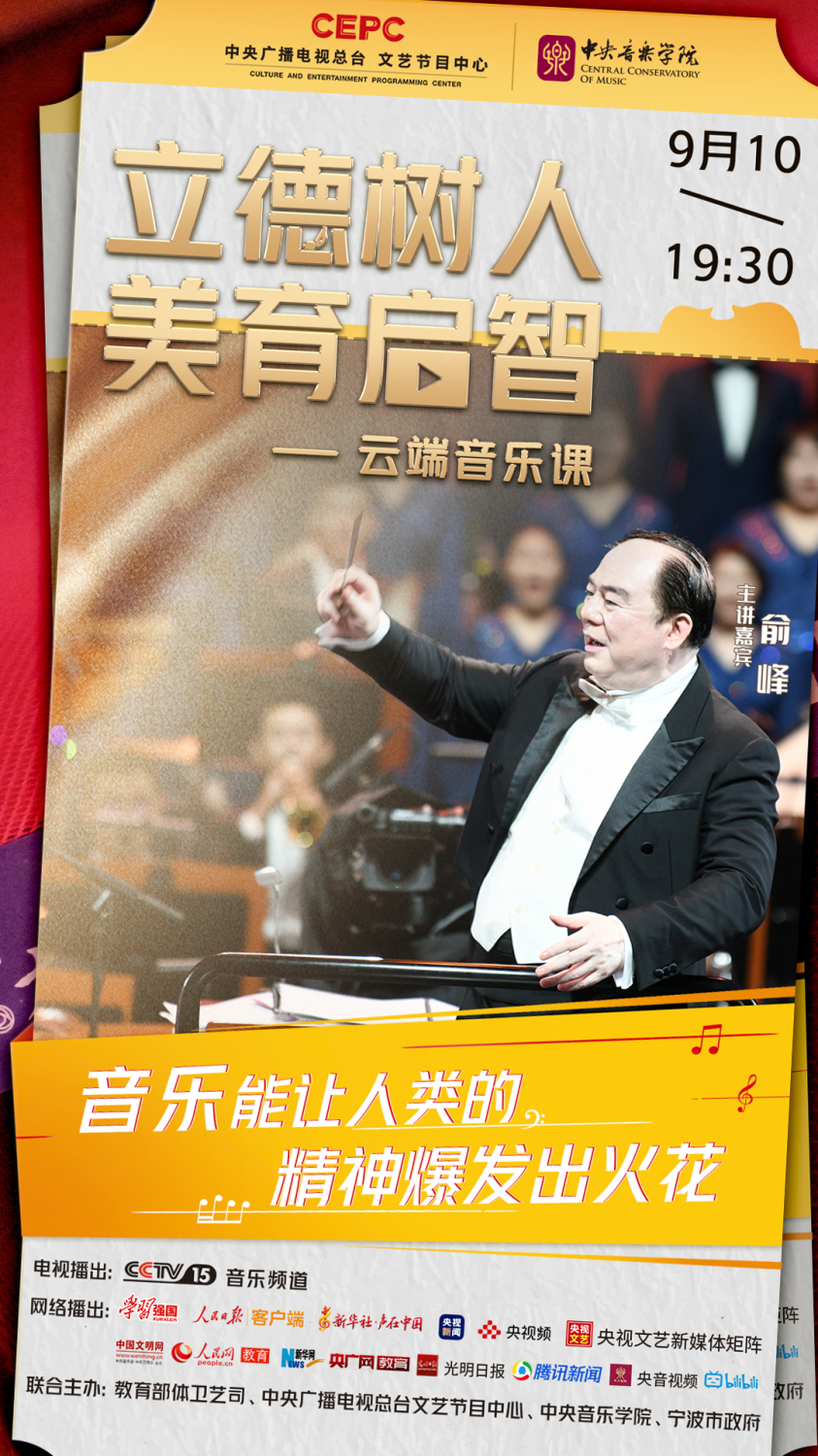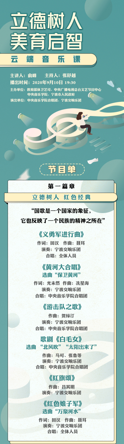 开云kaiyun官方网站院长、著名指挥家俞峰教授将担任主讲人,同时执棒开云kaiyun官方网站合唱团、宁波交响乐团,为学生们献上《黄河大合唱》《红旗颂》《我的祖国》等15部音乐精品,带领同学们聆听跨越时光的音乐作品,体会感人至深的音乐力量。