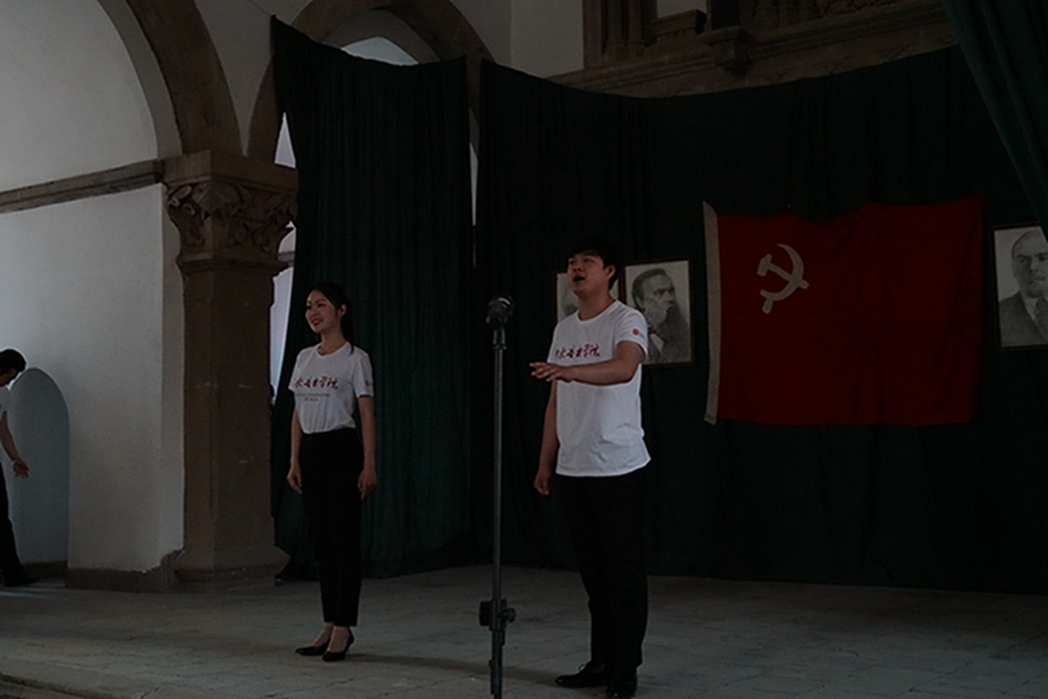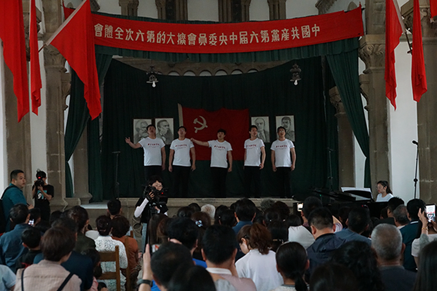 尤其值得一提的是,音乐会是在鲁艺旧址的大教堂举行,这是这座教堂时隔74年(延安鲁艺1945年迁往东北)以来的首次演出。这栋建筑历经风雨战火,墙体剥蚀,铺地灰色的青砖坑坑洼洼变成黄土色,然而当嘹亮的歌声灌满整个厅堂、在红色的横幅中激荡,庄严神圣的革命情怀油然而生,让人立时热泪盈眶。