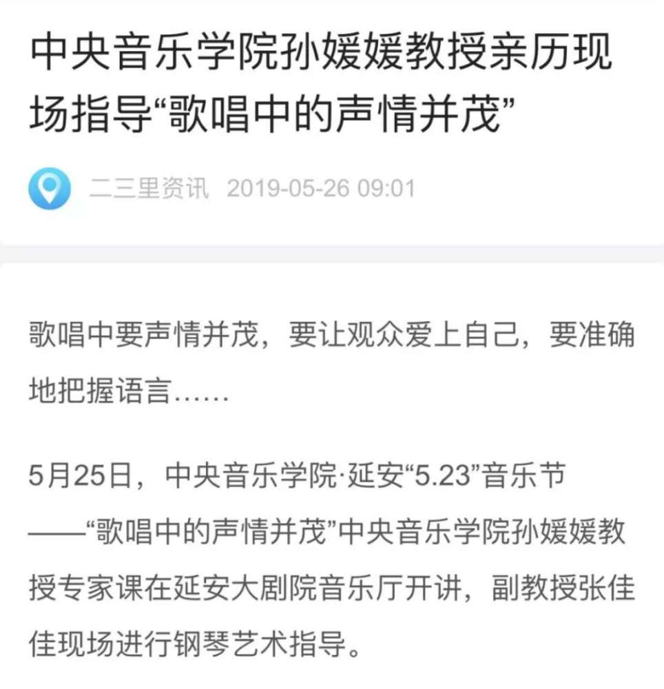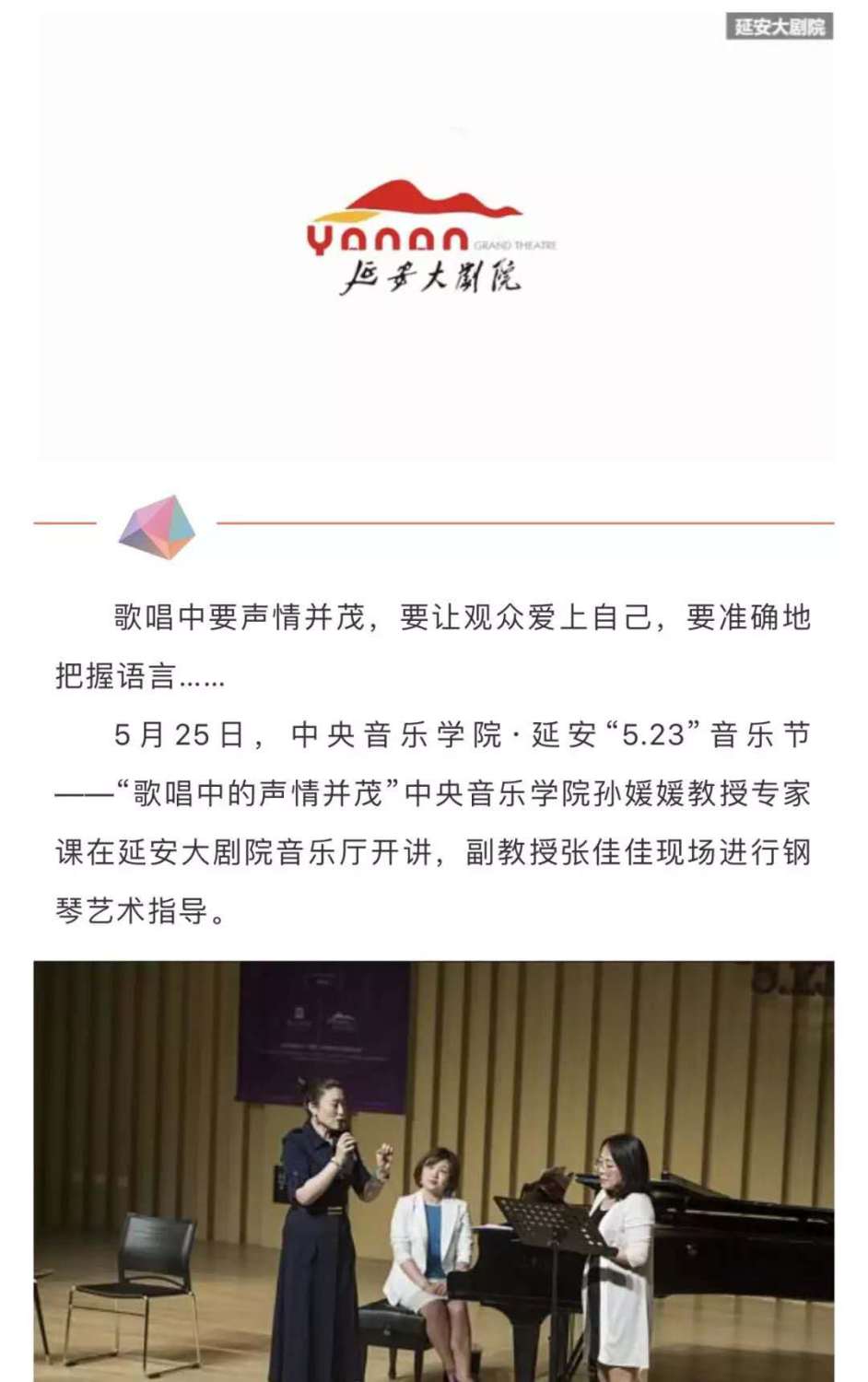 5月25日,开云kaiyun官方网站·延安“5.23”音乐节——“歌唱中的声情并茂”声乐歌剧系孙媛媛教授专家课在延安大剧院音乐厅圆满举行。孙媛媛教授对延安的音乐教师进行了声乐指导,张佳佳副教授担任钢琴艺术指导。