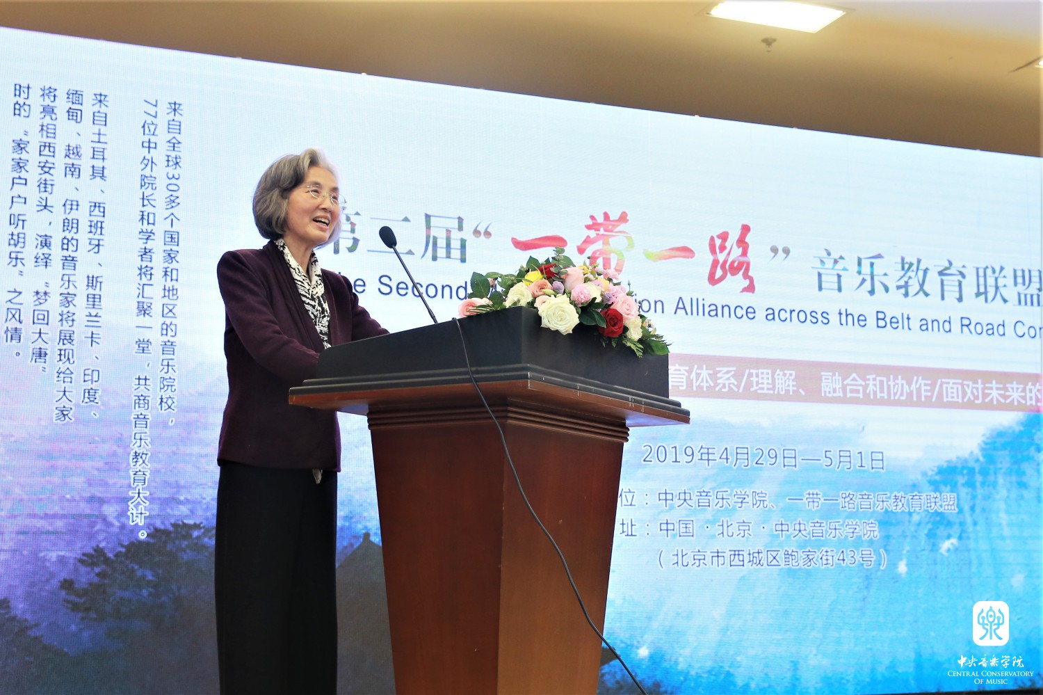 郭淑兰在讲话中回顾"联盟"成立以来的发展历程,指出在组织建设、音乐教育交流与演出、学术研究等方面均取得了可喜成果。"一带一路"音乐教育联盟被列入“一带一路”国际合作高峰论坛项目成果清单,教育部国际司批准成立了"一带一路"音乐交流与研究中心,成立了秘书处;"联盟"成员稳步增加,含盖了东北亚、东南亚、中亚、中东欧等各国音乐学院;联盟开展了多样化的"一带一路"音乐教育交流和演出;创作并演出一批"一带一路"音乐原创作品;组织开展"一带一路"音乐和音乐教育研究课题,先后申报立项11个研究课题,组织编辑出版了《丝绸之路音乐研究文集》。