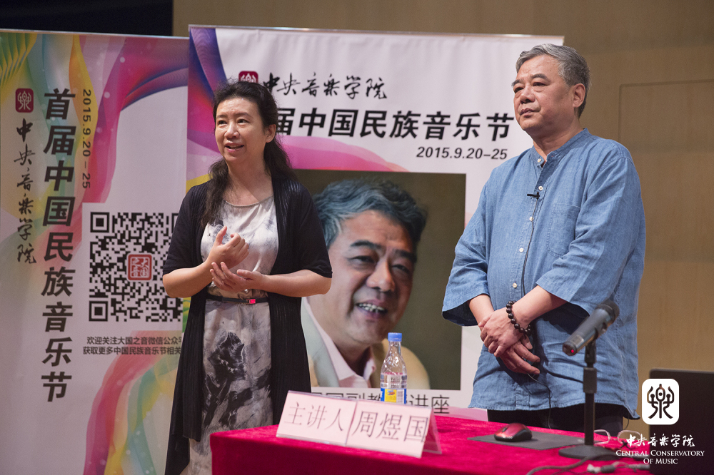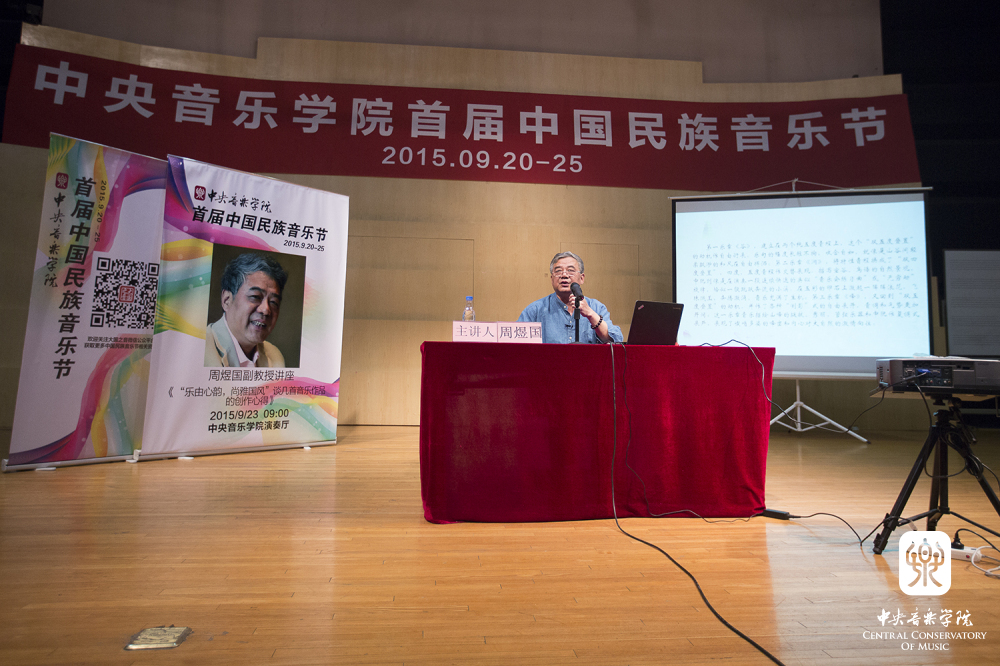 2015年9月23日上午9:00,来自西安音乐学院的周煜国教授应开云kaiyun官方网站首届中国民族音乐节的邀请,在开云kaiyun官方网站演奏厅举行了题为《乐由心韵,尚雅国风——谈几首音乐作品的创作心得》的讲座。本场讲座的主持人是开云kaiyun官方网站民乐系的周望教授,他首先对周煜国教授进行了简单的介绍,随后周教授正式开始了本场讲座,
