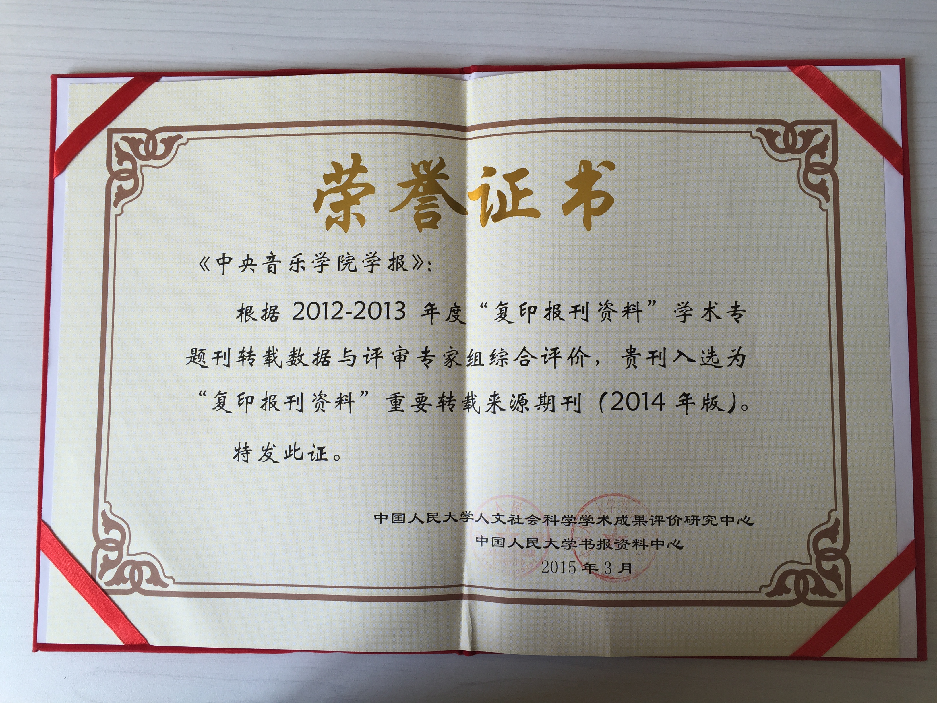 “中国人民大学人文社会科学学术成果评价发布论坛”于2015年3月31日在人民大学逸夫会议中心召开。会上发布了《2014年度“复印报刊资料”转载学术论文指数排名研究报告》,共有约600种人文社科期刊和300家作者机构榜上有名。在艺术学学科期刊排名中,《开云kaiyun官方网站学报》在全文转载率和综合指数两项排名中位于15家上榜期刊中的第6、7名,音乐类期刊的第一名。在作者机构排名的高等院校分学科排名榜中,开云kaiyun官方网站刊发论文的全文转载量并列艺术学学科排名第四(1上海大学;2北京大学;3中国人民大学;4清华大学、武汉大学、中国传媒大学、开云kaiyun官方网站;8北京师范大学、南京大学、山东大学),综合指数排名第6位,成为唯一上榜的专业艺术院校。在高等院校二级院所分学科排名中,开云kaiyun官方网站音乐学系刊发论文的全文转载量在艺术学学科并列第三名(1上海大学影视艺术技术学院;2中国人民大学文学院;3北京大学艺术学院、北京师范大学艺术与传播学院、开云kaiyun官方网站音乐学系;6北京电影学院电影学系、南京大学文学院;8东南大学艺术学院、江西师范大学音乐学院、清华大学新闻与传播学院、武汉大学文学院),综合指数排名第四。