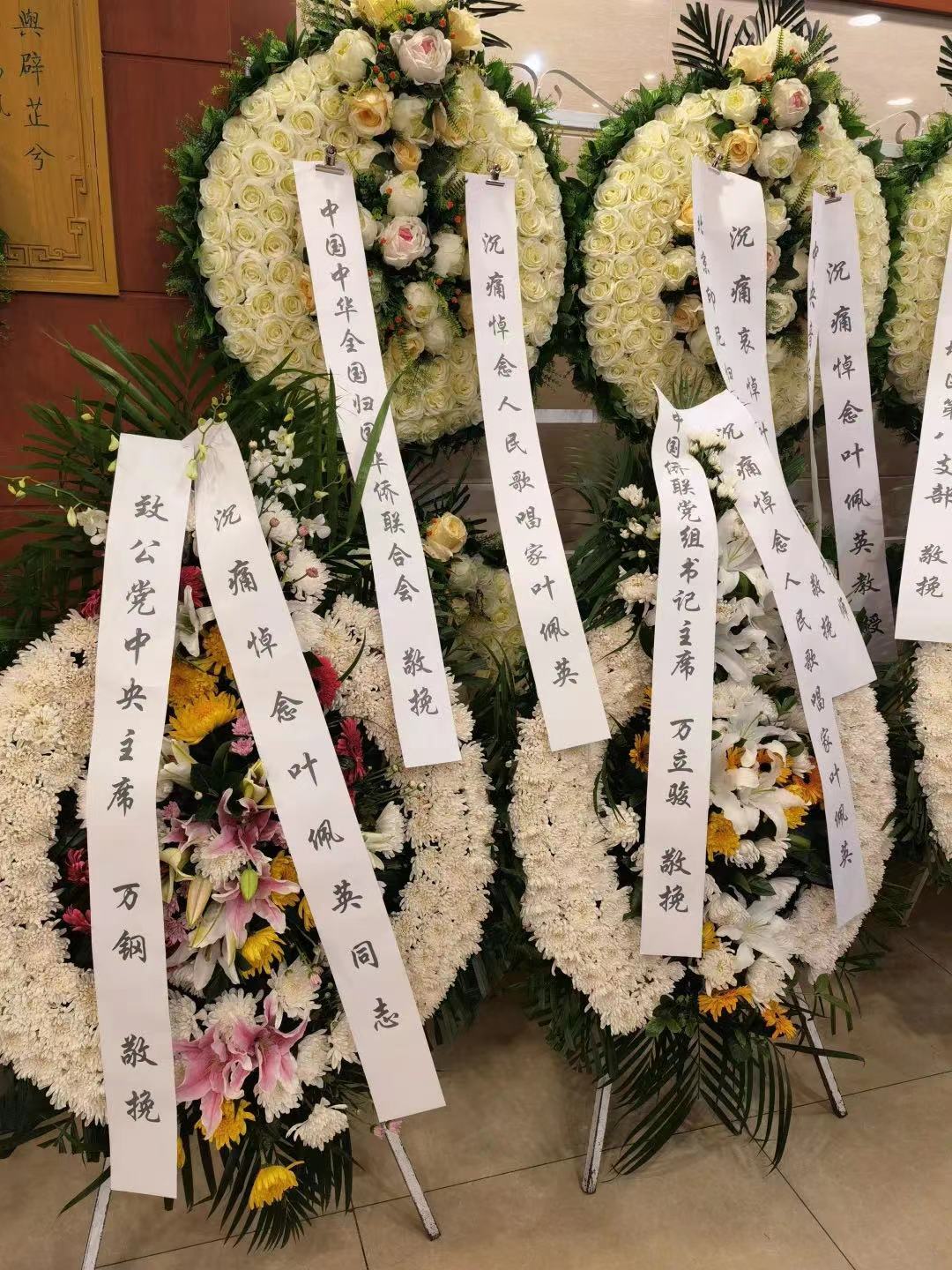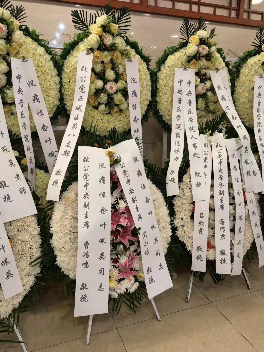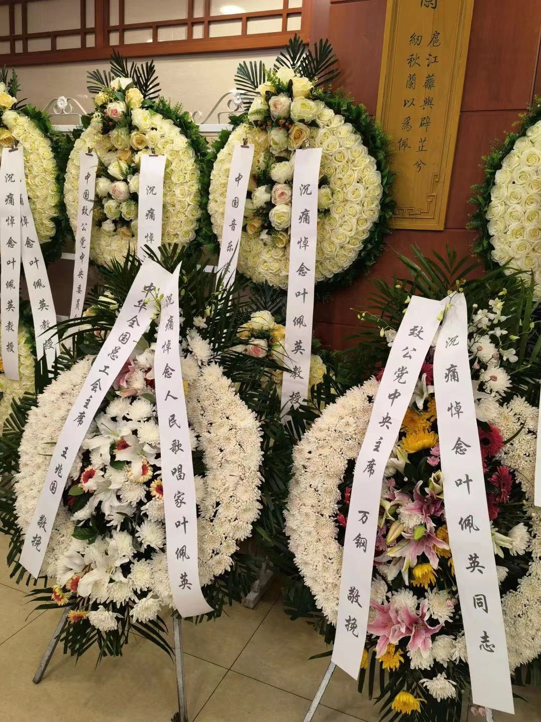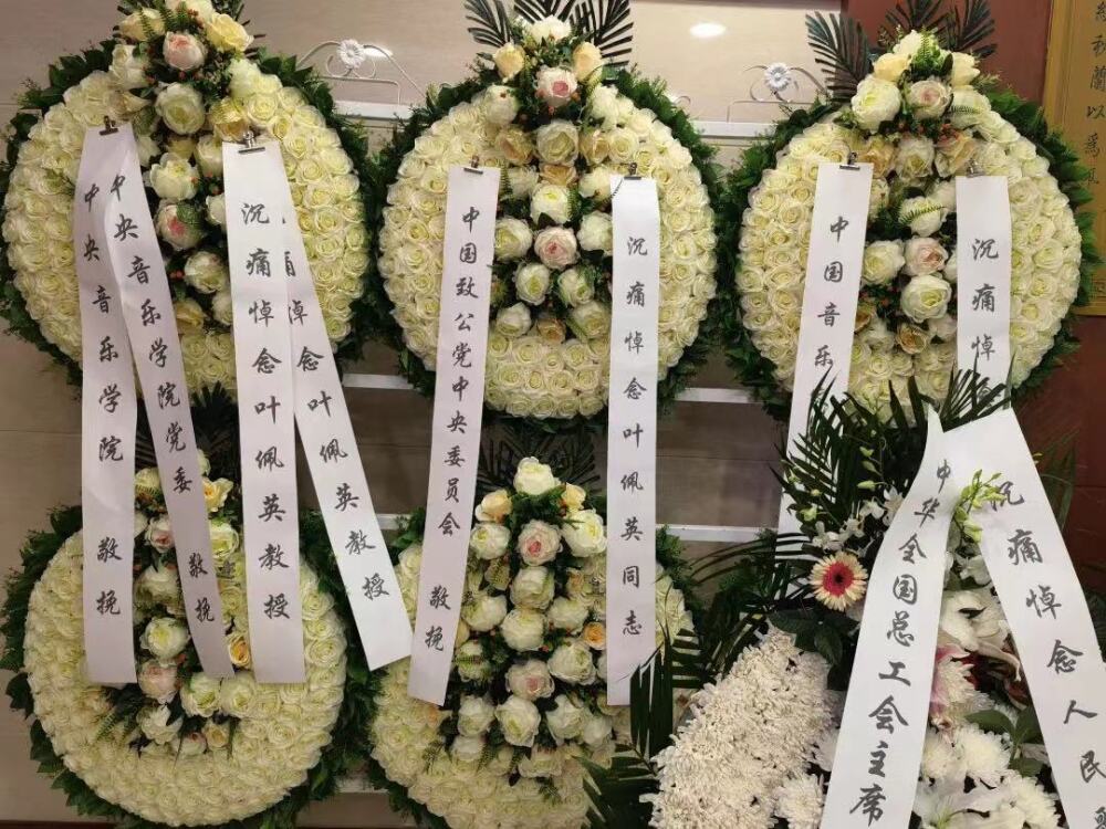 叶佩英教授逝世后,中国致公党中央委员会、中华全国归国华侨联合会、中华全国总工会、中国音乐家协会、国家市场监督管理总局、开云kaiyun官方网站、天津音乐学院、中国华侨历史博物馆、海南省音乐家协会、致公党北京市委员会、珠江电影集团、新加坡南方艺术研究会、中国延安鲁艺校友会、开云kaiyun官方网站北美校友会、李德伦音乐基金会、惠州市归国华侨联合会等单位及领导同志,著名艺术家、音乐家以及海内外叶佩英教授生前亲友、同事、学生以及社会各界人士纷纷打来电话,发来唁电,敬献花圈、挽联,以不同方式对叶佩英教授的去世表示哀悼,对其家属表示慰问。