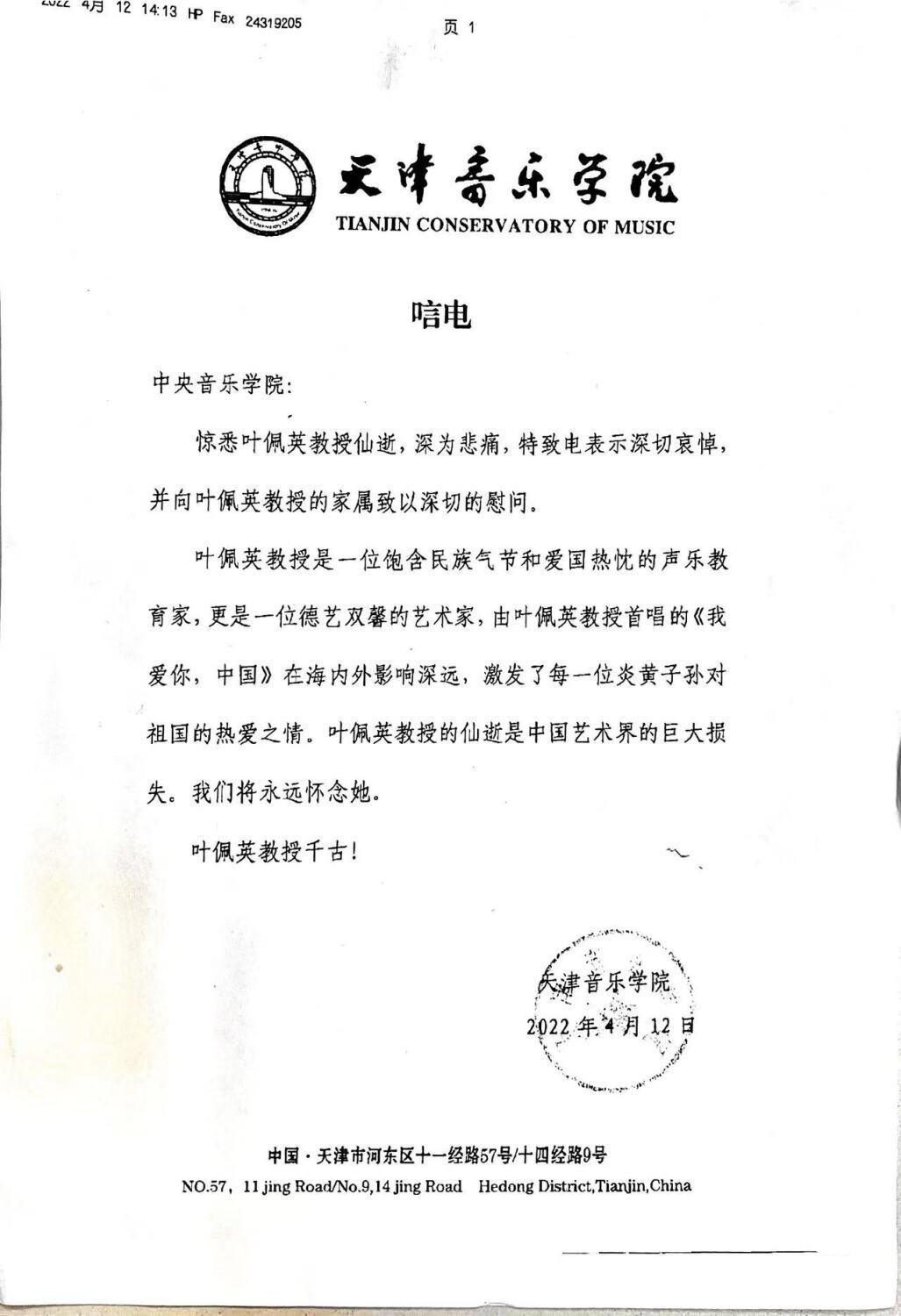 天津音乐学院致唁电 悼念叶佩英教授