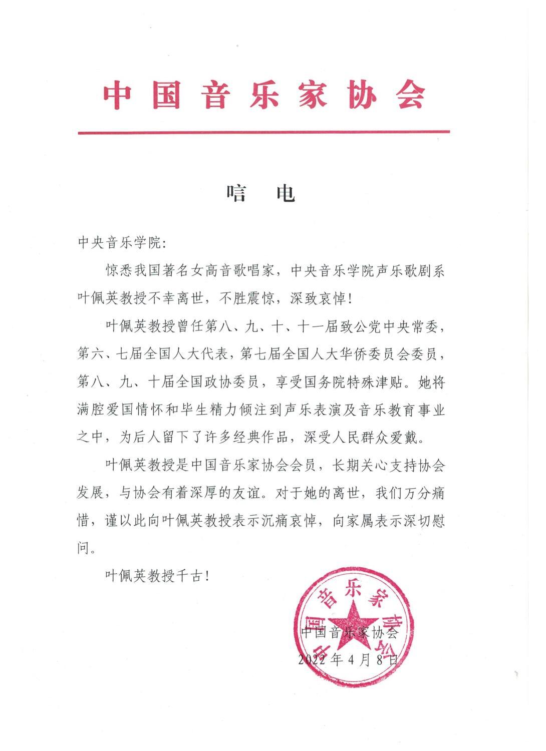 中国音乐家协会致唁电 悼念叶佩英教授