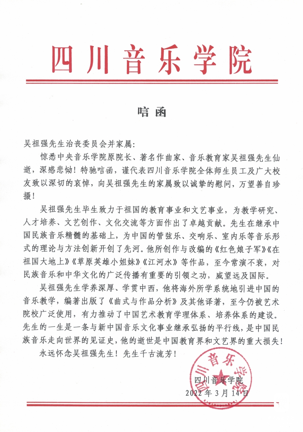 四川音乐学院致唁电 悼念吴祖强教授