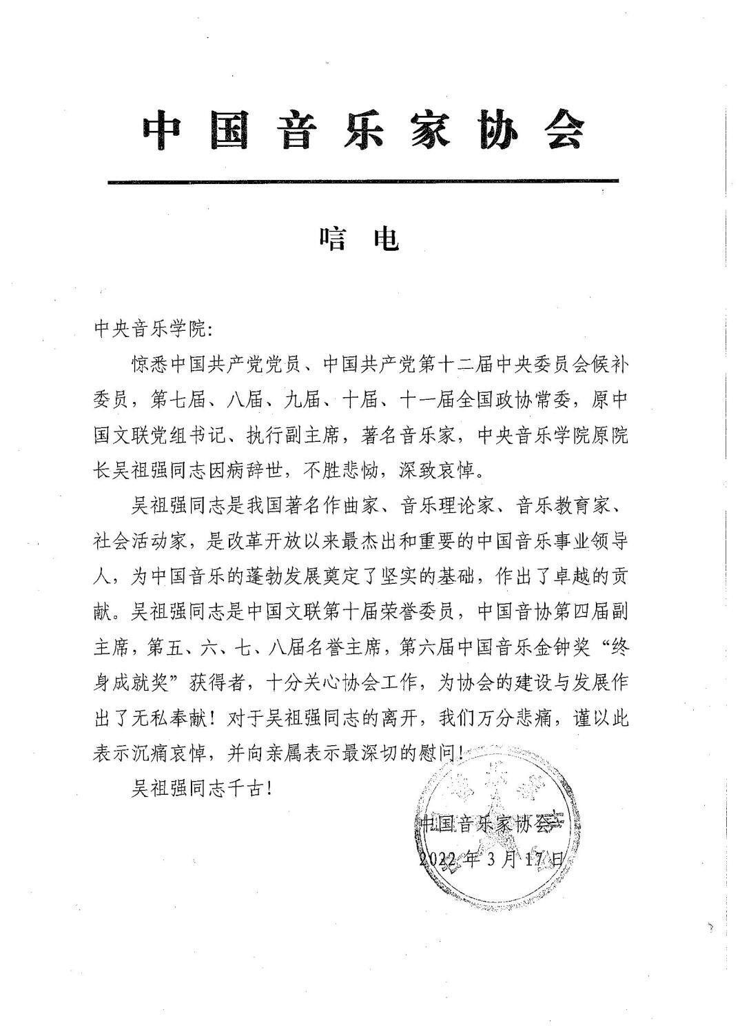 中国音乐家协会致唁电 悼念吴祖强教授