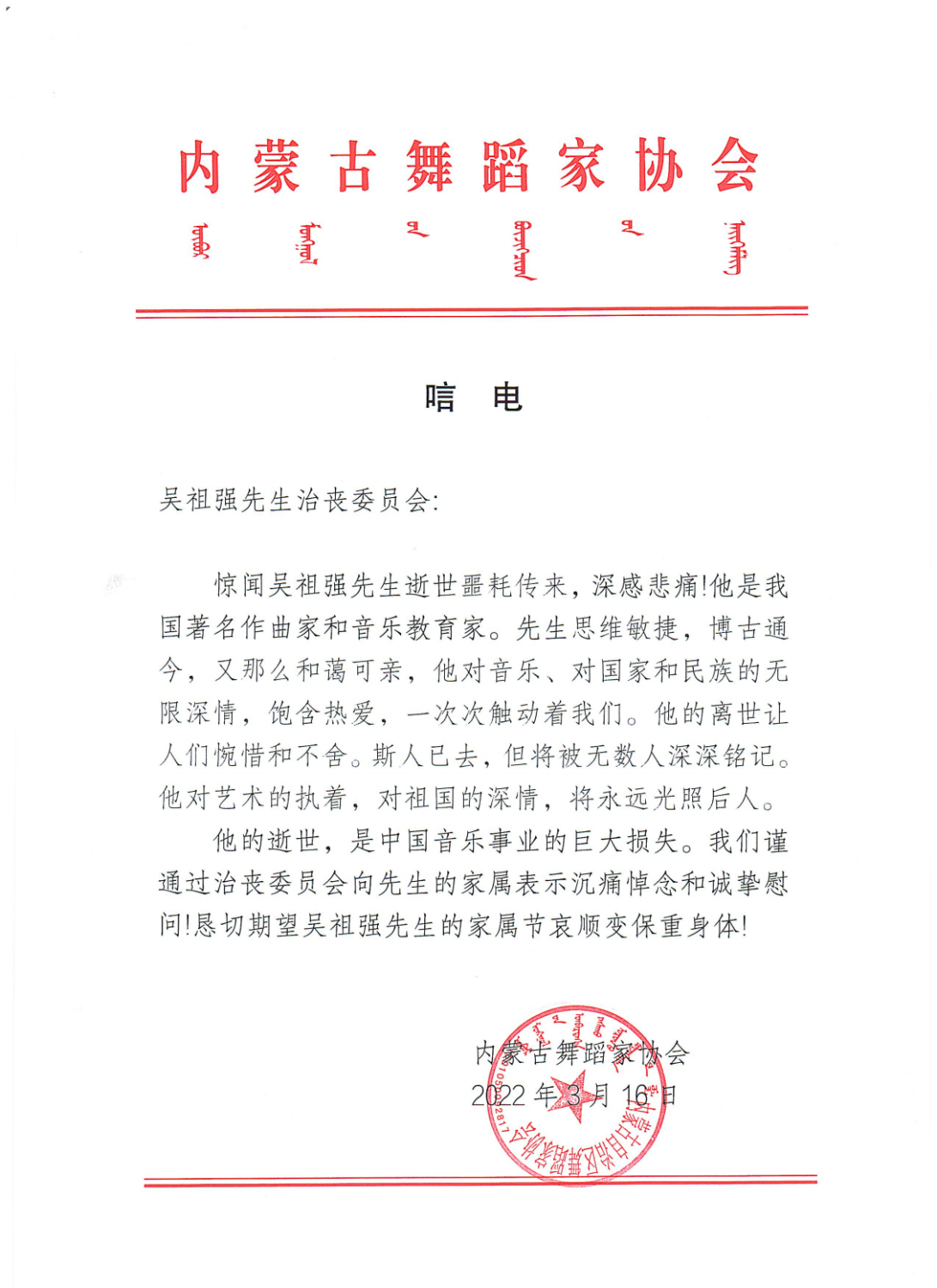 内蒙古舞蹈家协会致唁电 悼念吴祖强教授