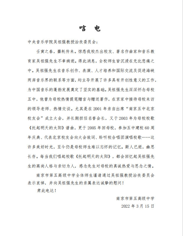 母校南京市第五高级中学致唁电 悼念吴祖强教授
