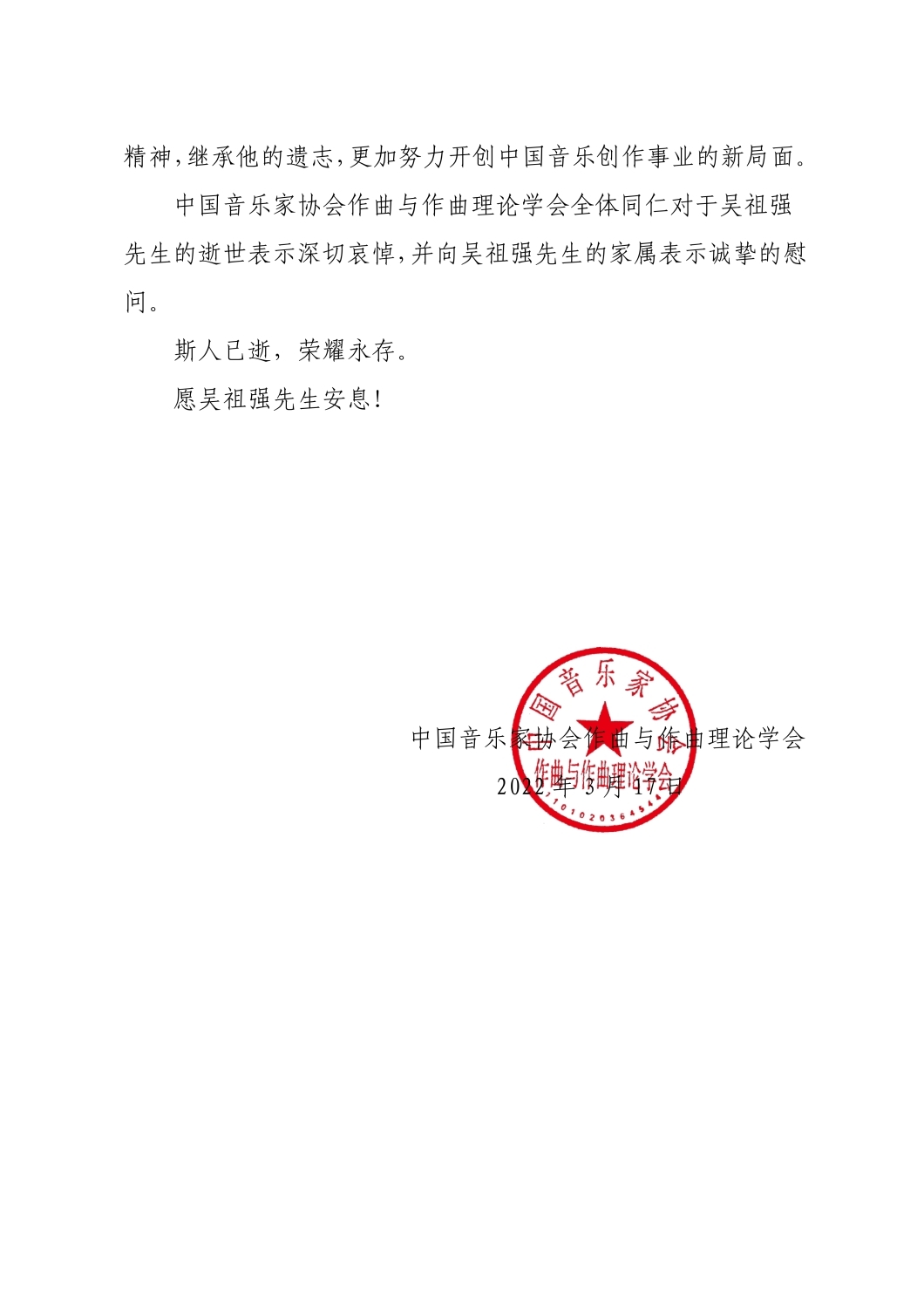 中国音乐家协会作曲与作曲理论学会致唁电 悼念吴祖强教授