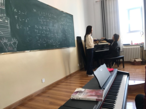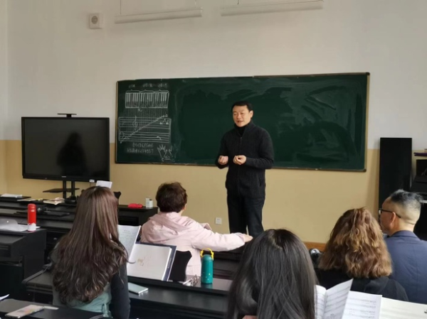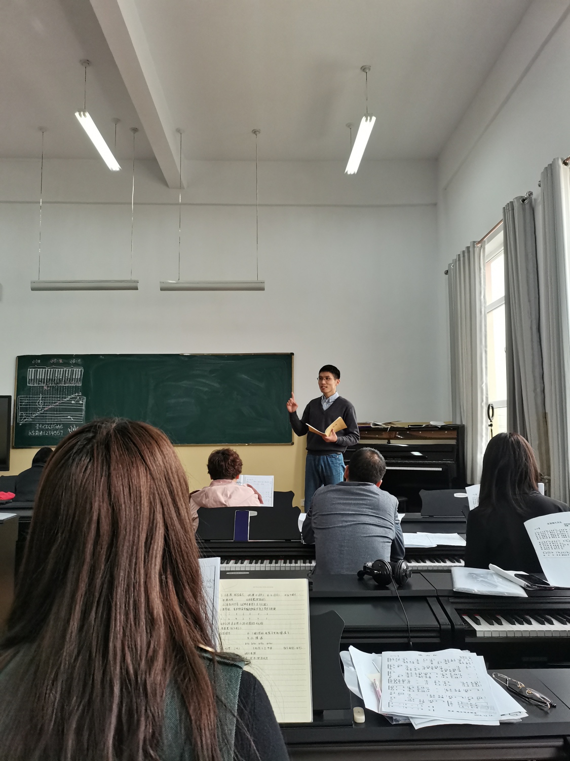 4月26日,作曲系师生接踵而至,开展教学,两位年轻老师在机场候机时就开始备课。系党总支书记陈泳钢教授讲授的《音乐聆听与分析》《指挥基础》,将博学深思转化为浅显的语言,娓娓道来,使学员们在愉悦的审美体验中收获满满。年轻讲师王典授课生动活泼,她的《视唱练耳》《合唱》课程以富有现场感的互动方式进行,并根据学员即时调整,取得良好的教学效果。作曲系在读博士生林桢邦的《钢琴即兴伴奏》课程,将钢琴伴奏的和声与织体化繁为简,可操作性强,学员反映不错。