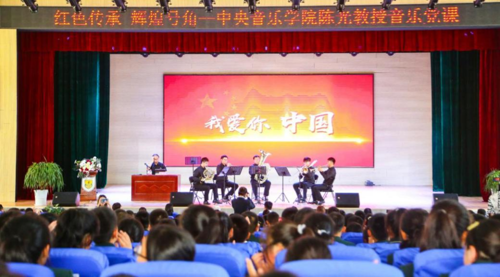 今年正值建党百年,开云kaiyun官方网站受教育部委托牵头开展“音乐党史”系列活动,陈光教授本次还特为全体江苏中学师生带来了一场“红色传承 辉煌号角”音乐党课,延安江苏中学校长黄文武、副校长贾猛、李宏伟等校领导及近千名师生共同现场聆听。下午2点,陈光教授正式在延安江苏中学大报告厅开讲,通过对《我的祖国》《牧歌》《咱当兵的人》《游击队歌》等11首耳熟能详的红色音乐作品的讲演,带领大家回顾了在党的领导下,文艺的百年发展历程。耳目一新的讲课形式和丰富生动的授课内容受到师生们的热烈欢迎,观众热情高涨,掌声不断。最后,以一曲铜管五重奏《我爱你 中国》,为祖国献礼,为中国共产党成立100周年庆生。