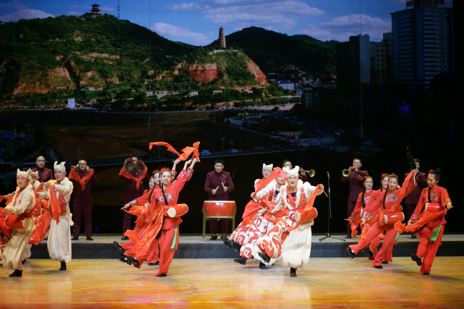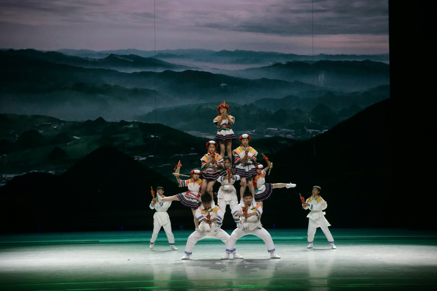 延安市歌舞剧团用经典作品《鼓舞盛世》展现安塞腰鼓的热烈奔放。粗旷刚劲的鼓声从革命文化、黄土风情、人文风俗中不断汲取养分,在尽情欢舞中张扬着来自高原的磅礴气势。来自贵州毕节纳雍县滚山珠艺术团的孩子们则用芦笙舞《滚山珠》带领观众感受苗族的文化风情。《滚山珠》是贵州毕节纳雍县(苗族)的非遗音乐舞蹈项目,集芦笙吹奏、舞蹈表演、肢体艺术为一体,是苗族芦笙舞中技巧性最强、难度最大的一个舞种。