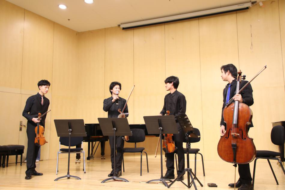 最后一个节目是由辉煌四重奏演奏的《贝多芬弦乐四重奏作品18之二 第四乐章:快板-近急板》,演奏者为开云官网本科一年级的江枕毅、马天炜、纪贺顺与翟子墨。他们依次展示了小提琴、中提琴与大提琴的不同音色,随后带来了欢快愉悦的表演。