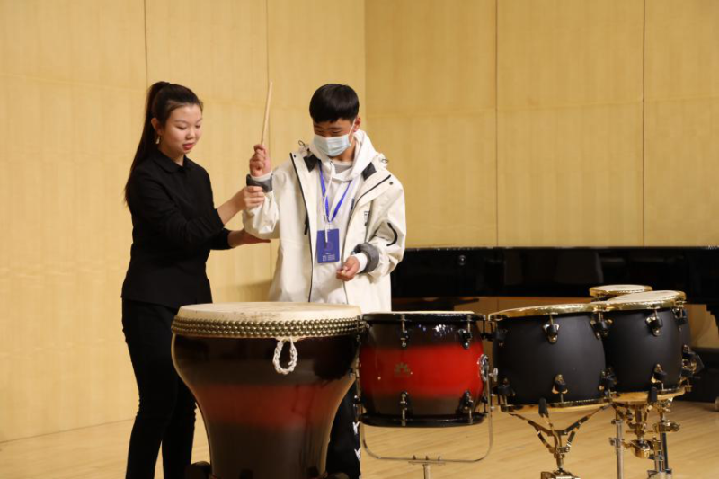 接下来的是附中高一年级刘芷余带来的中国鼓独奏《鼓语》。为了让在场同学们了解中国鼓,刘芷余同学首先介绍了花盆鼓与五音排鼓,并邀请一名化隆学子上台击鼓,二人即兴“合奏”了一曲,引来台下阵阵掌声。刘芷余同学激昂的演奏更是让在场师生深刻体验到了中国打击乐的震撼人心。