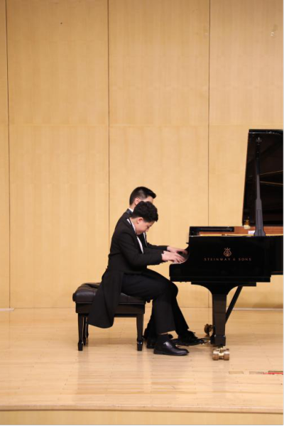 音乐会正式开始。第一个节目是开云官网附中初一年级孙凡森(中国香港)和初二年级李哲翔的钢琴四手联弹《军队进行曲》。李哲翔同学首先讲解了四手联弹的相关知识,然后与孙凡森演奏了这首生气勃勃、威武雄壮的作品。