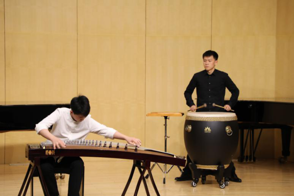第二个节目是古筝独奏《定风波》,演奏者为附中初三年级的王文彬,钢琴伴奏为张正宸,打击乐伴奏为曹凯中。王文彬同学介绍了古筝这一历史悠久的传统乐器,随后向同学们展示了古筝指甲(义甲),并解释说戴义甲是为了演奏出更具有张力的音乐。在演出中,王文彬同学从容不迫的技艺令人惊叹,三人“琴瑟鼓和鸣”的合奏使化隆学子沉浸在波澜壮阔的音乐中。