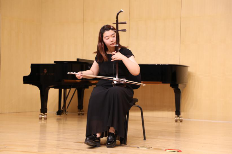 第六个节目是二胡独奏《新赛马》,演奏者是本科一年级的冯潇。她向同学们展示了二胡的琴弦以及弓子,并用二胡模仿了鸟叫声与马的嘶鸣声。一曲《新赛马》增进了化隆学子对于我国传统乐器二胡的认识,并通过二胡演奏感受到了音乐表达自然万物的奥妙。