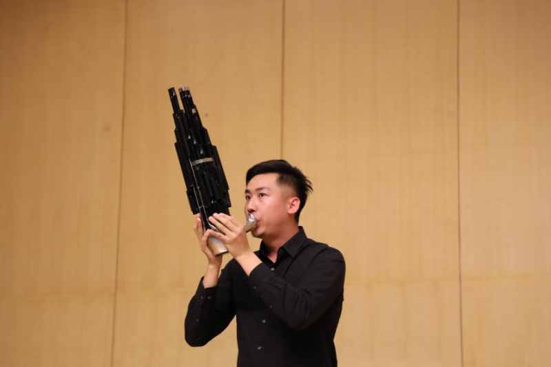 接下来是笙独奏《微山湖船歌》,演奏者是研究生二年级的刘立昊。刘立昊同学从“滥竽充数”的故事讲起,介绍了这件具有三千年历史的中国传统乐器——笙,并进行了精妙绝伦的演奏。