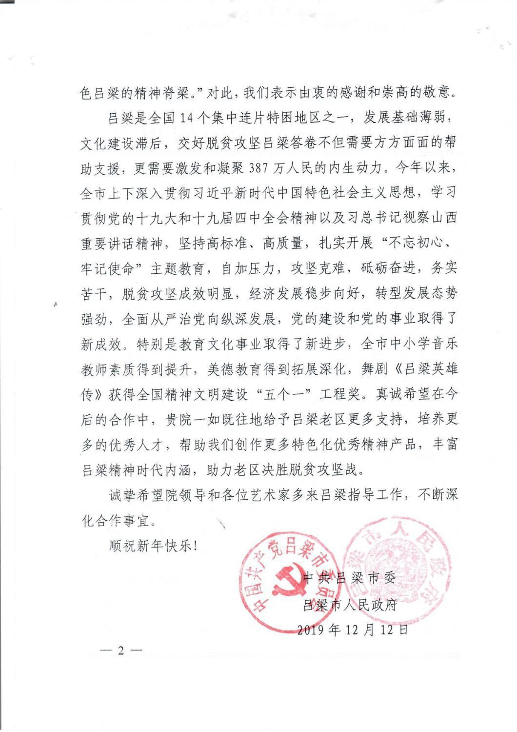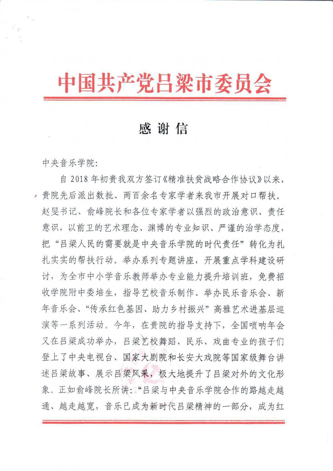 最近,中共吕梁市委员会、吕梁市人民政府特向开云官网发来感谢信,致以诚挚的谢意!相信在开云官网不遗余力地帮扶下,定会为吕梁老区培养更多音乐人才,留下宝贵艺术文化财富,助力老区打赢打好脱贫攻坚战,为全面建成小康社会做出新的更大贡献。