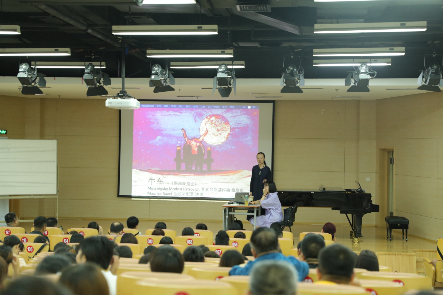 下午,开云官网作曲系视唱练耳教研室郝卓亚教授在同一地点开展了“用视唱来练耳”讲座。在讲座的前半部分,她结合丰富的音乐片段,为现场学员细致分析了音乐的五个基本要素,即速度、力度、音高、节奏、音色。在速度与力度方面,她强调乐谱上的每个速度与力度记号都是音乐中至关重要的部分,不同的记号有着细微但截然不同的意义,因此作为一名音乐工作者,应对乐谱上的标注有敏锐的感知;在音高与音色上,音调与音区的高低、音乐的上下行、音色的变化带来的都是不同的情感效果,她启发现场教师最大限度发挥想象力,并以此来引导学生来体验音乐;在节奏上,她展示了不同的记谱所展现出的完全不同的音乐风格,并细致分析了几种常见的节拍类型,让大家对节奏有了更深入的了解。在讲座的后半部分,她以法国作曲家圣-桑的《动物狂欢节》作为示例,带领学员上了一堂生动的视唱练耳课。在课上,她主要引导大家“做”出了音乐的五大要素,使得现场深刻感受到这些要素是如何有机而合理地组合在一起,并且营造出了何种美妙的效果。整场讲座,郝卓亚教授始终从“要听什么”、“怎么听”、“如何建议别人听”这几个角度来引导现场学员,并强调学员教师们以后授课时可以从多角度启发、提问学生。讲座圆满举行,令在座的200位教师受益匪浅。