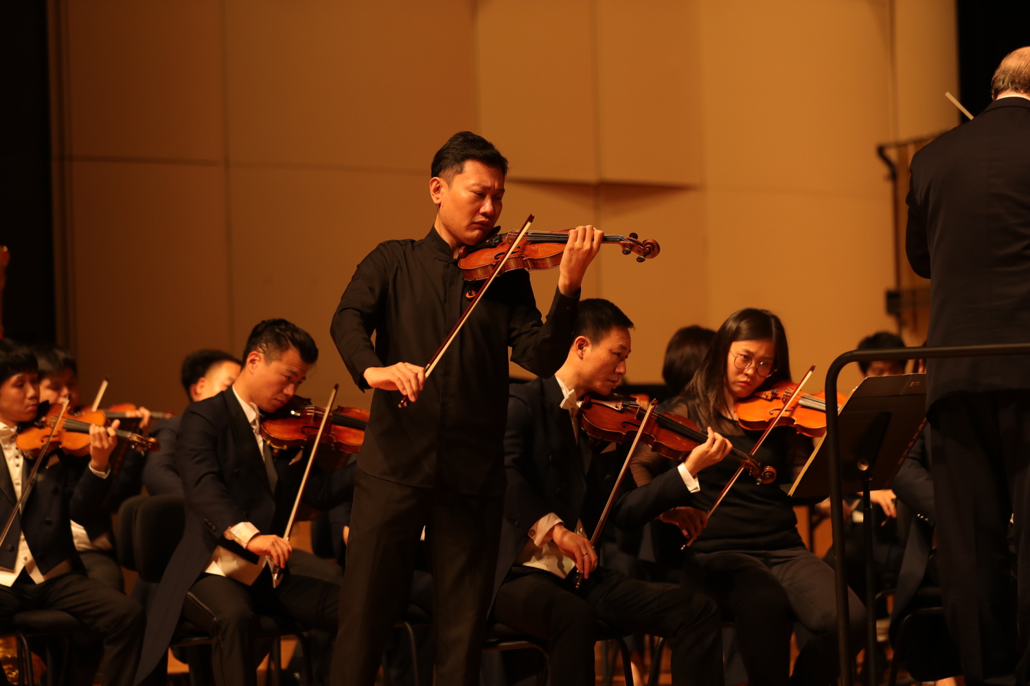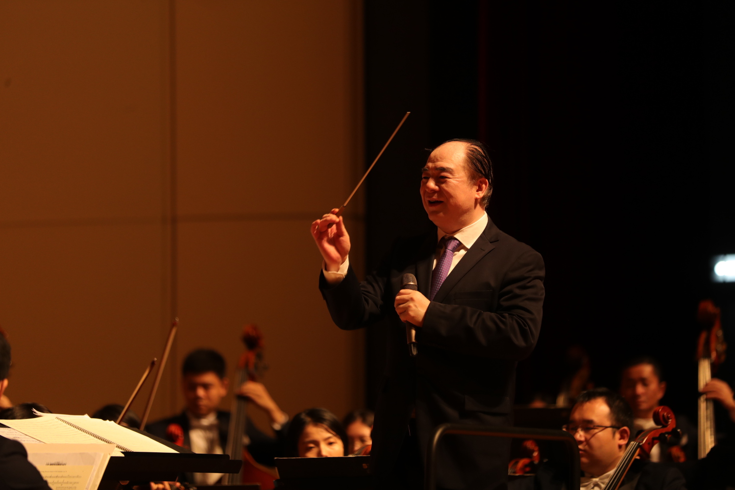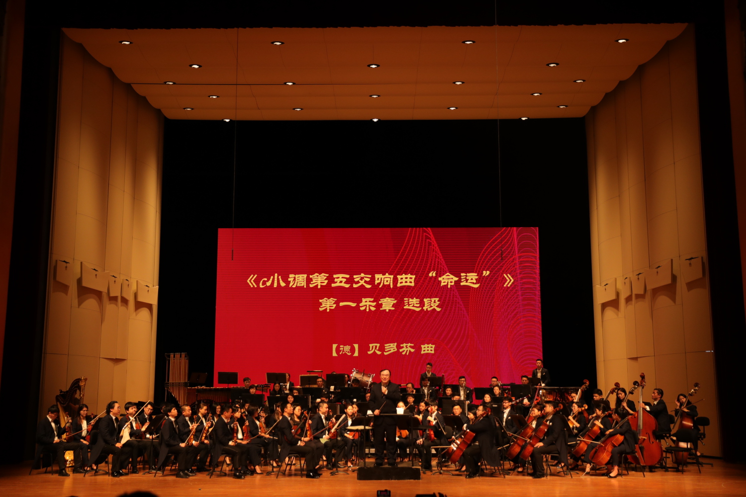 开班仪式结束后,随着激昂的《义勇军进行曲》响起,俞峰院长携开云kaiyun官方网站交响乐团及陈曦、宋元明、王传越等一众音乐家,以讲解、演出相结合的方式,给现场的吕梁学员带来了一堂生动的音乐欣赏课。在这堂课上,俞峰院长介绍了横跨交响乐、协奏曲、歌剧、舞剧等多种体裁的10首中外经典音乐作品,包括我国第一部民族歌剧《白毛女》、小提琴协奏曲《梁山伯与祝英台》、民族芭蕾舞剧《红色娘子军》、贝多芬《c小调第五交响曲“命运”》、歌剧《图兰朵》等,并结合党的文艺理论、大量中西音乐史料进行了细致的讲解。俞院长的讲解与音乐家们激情澎湃、震撼人心的音乐深深感染着在座的200多位学员。最后俞峰院长指挥全体演职人员与学员,在《我和我的祖国》的歌声中结束了这堂音乐欣赏课。