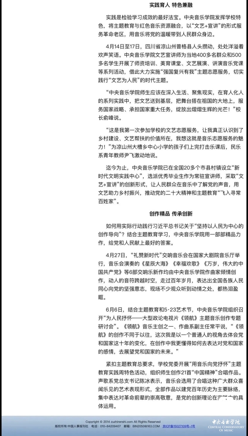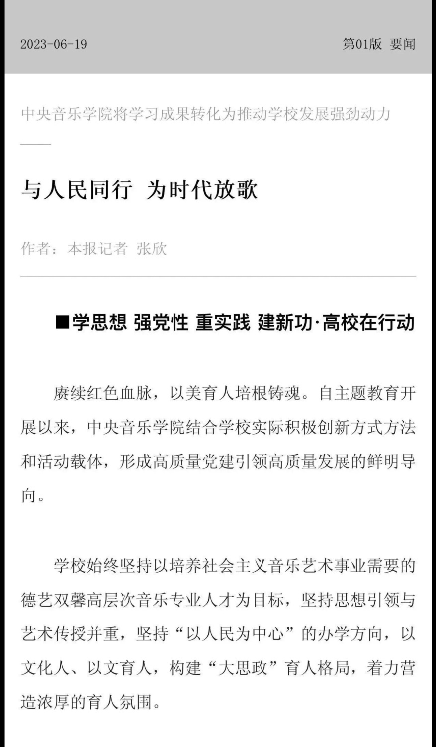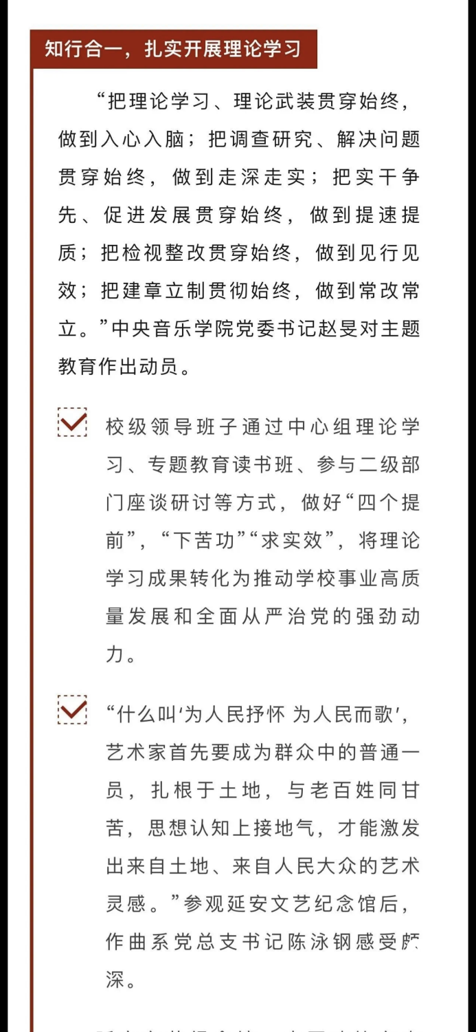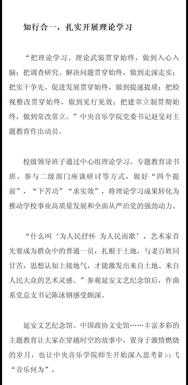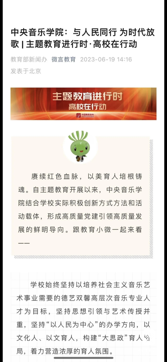 赓续红色血脉,以美育人培根铸魂。自主题教育开展以来,开云kaiyun官方网站结合学校实际积极创新方式方法和活动载体,形成高质量党建引领高质量发展的鲜明导向。学校始终坚持以培养社会主义音乐艺术事业需要的德艺双馨高层次音乐专业人才为目标,坚持思想引领与艺术传授并重,坚持社会主义的办学方向,以文化人、以文育人,构建“大思政”育人格局,着力营造浓厚的育人氛围。