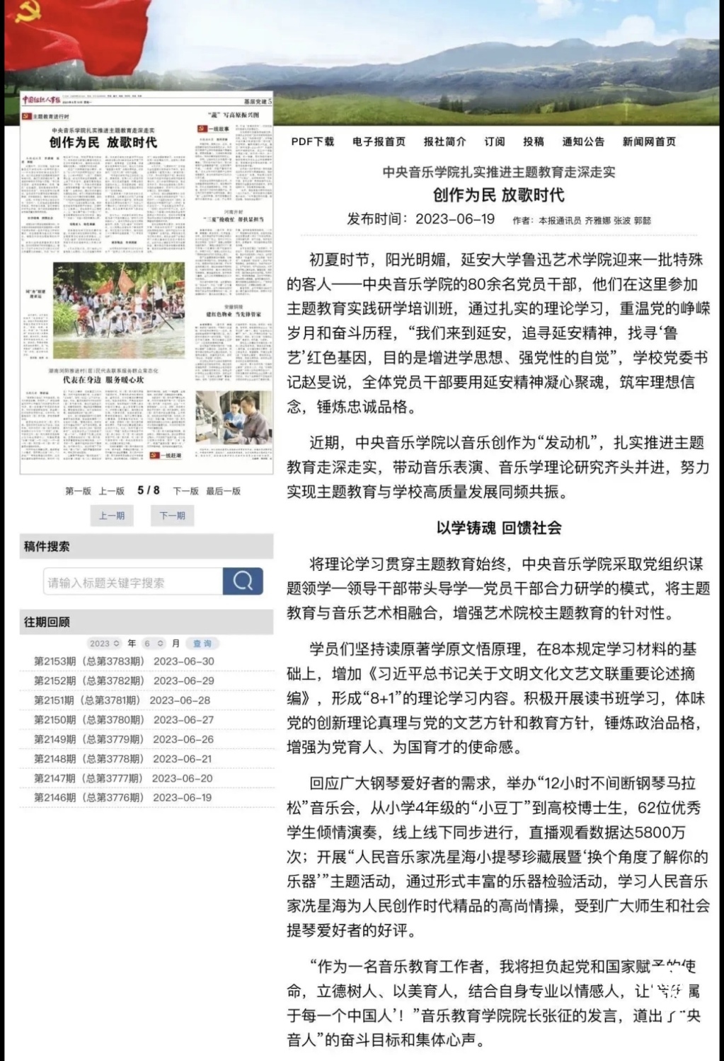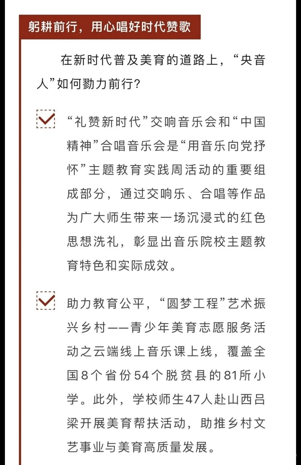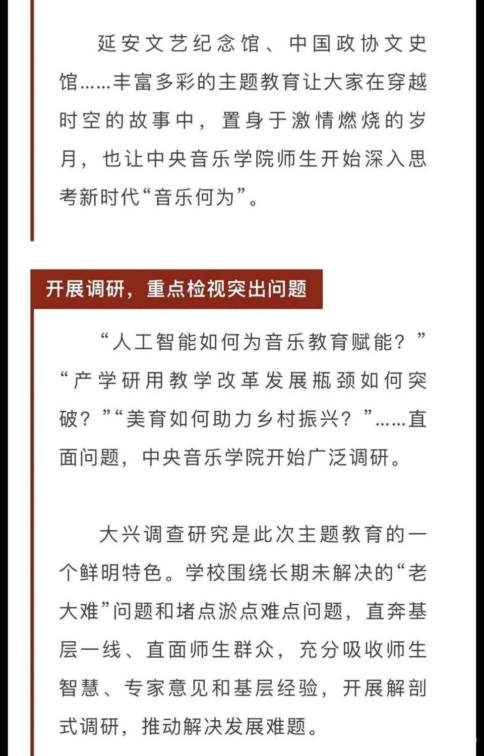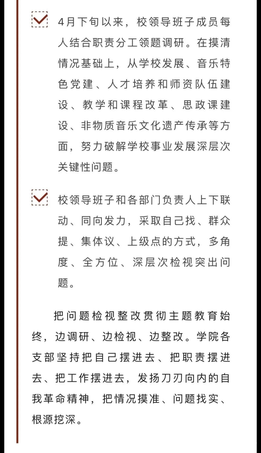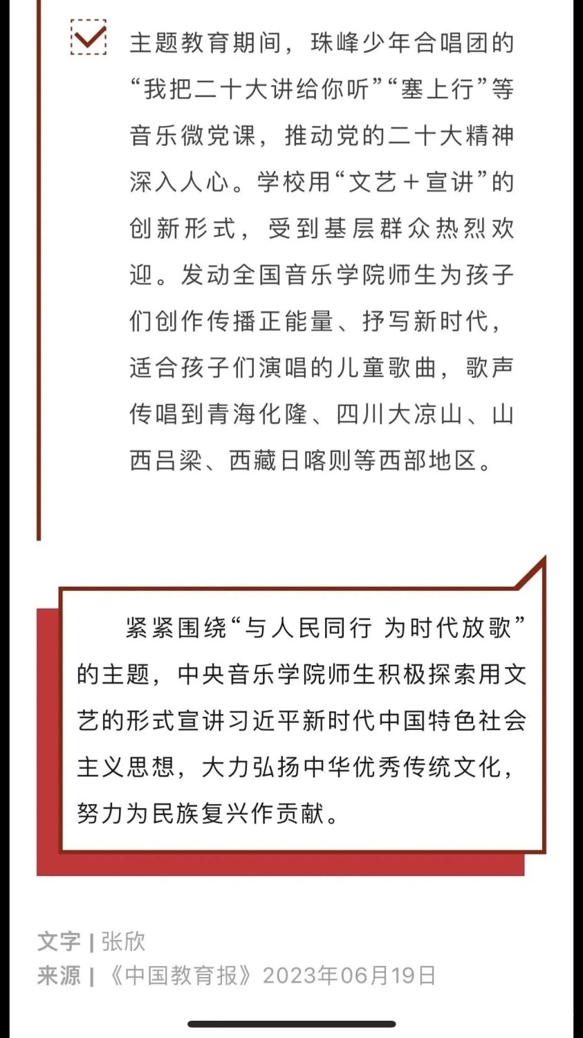 赓续红色血脉,以美育人培根铸魂。自主题教育开展以来,开云kaiyun官方网站结合学校实际积极创新方式方法和活动载体,形成高质量党建引领高质量发展的鲜明导向。学校始终坚持以培养社会主义音乐艺术事业需要的德艺双馨高层次音乐专业人才为目标,坚持思想引领与艺术传授并重,坚持社会主义的办学方向,以文化人、以文育人,构建“大思政”育人格局,着力营造浓厚的育人氛围。