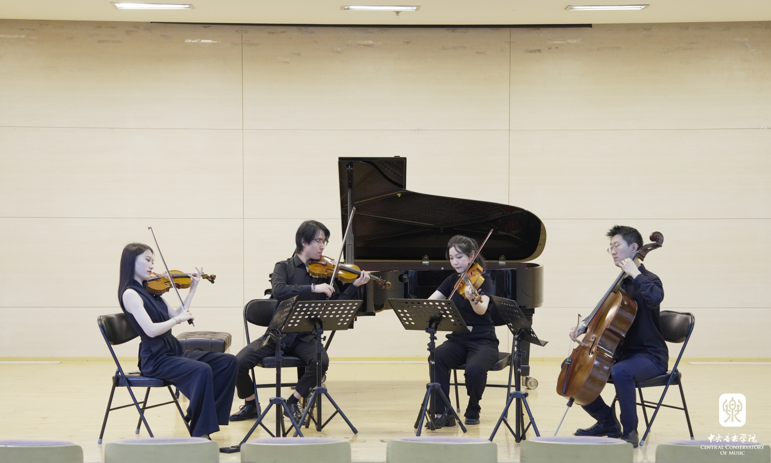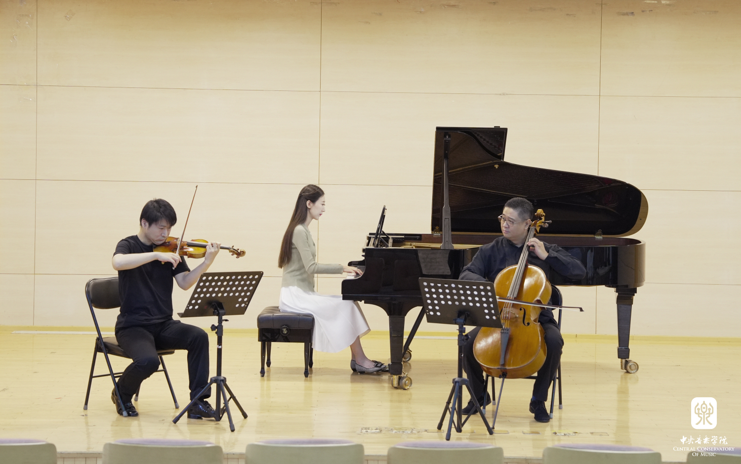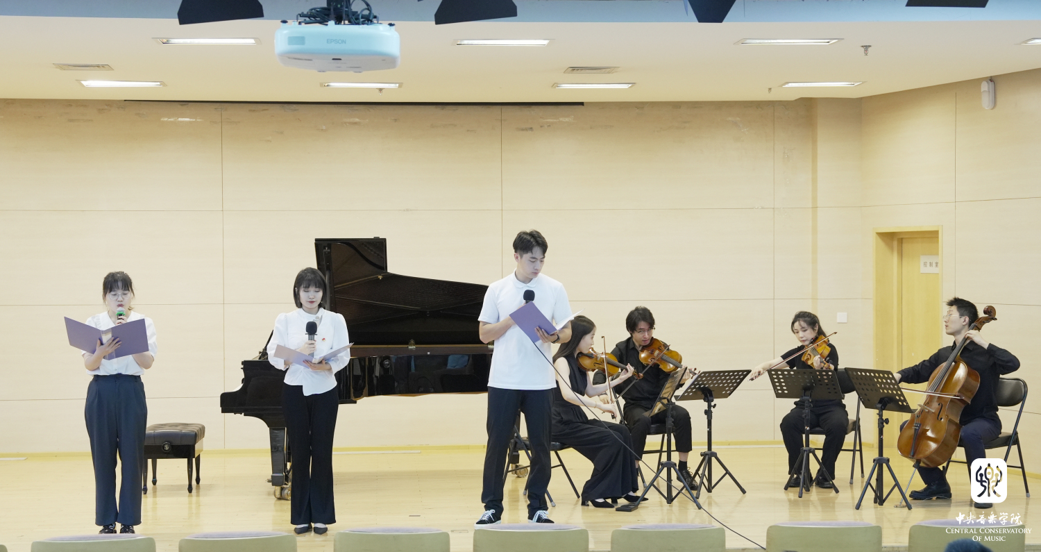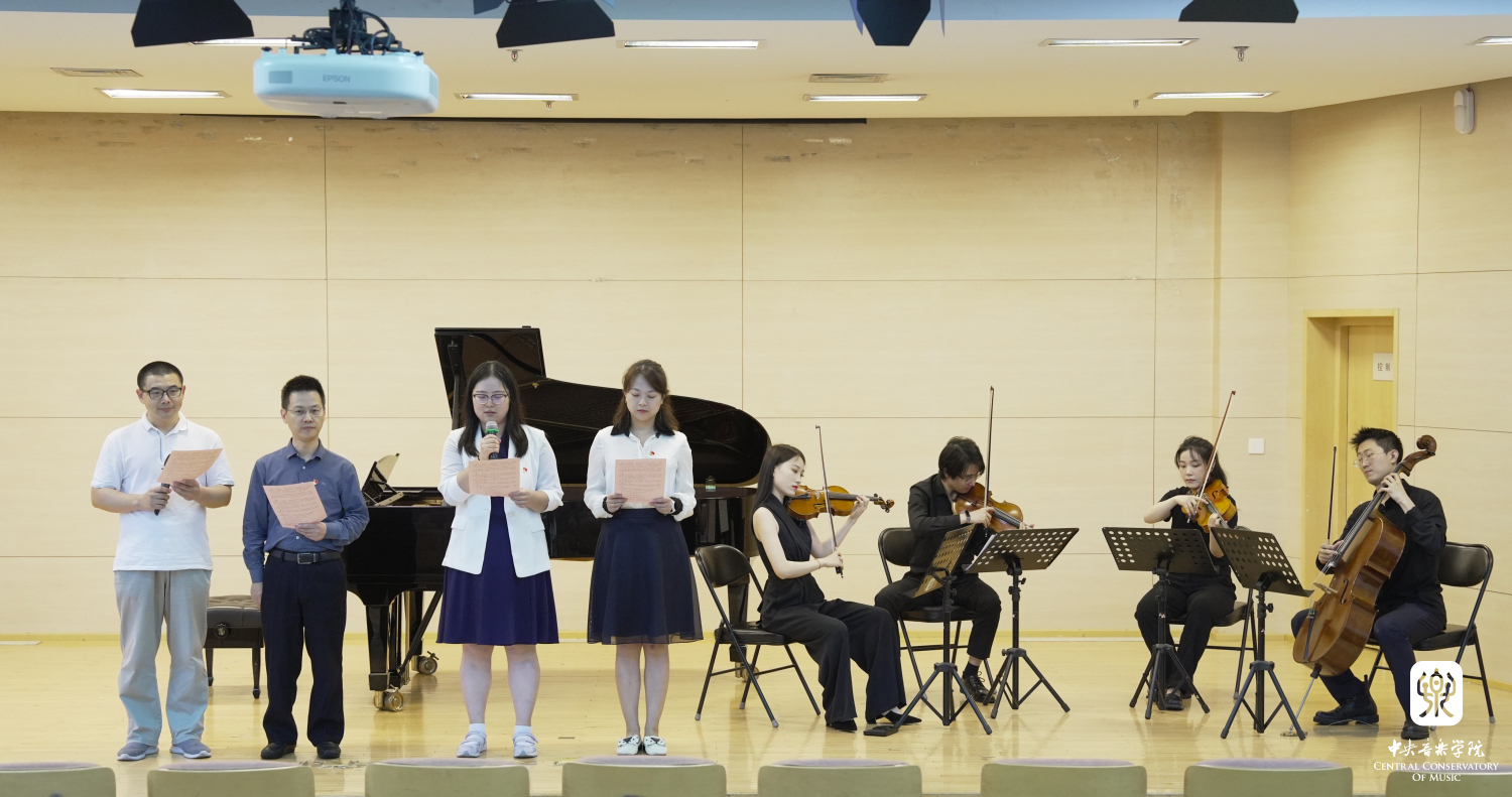 观摩结束后,全体党员来到教学楼701进行主题教育学习成果展示,全国政协三个支部的党员代表与开云官网管弦系学生共同完成配乐朗诵《习近平著作选读》《共产党宣言》(片段),管弦系学生带来乐器合奏《我爱你,中国》和《红星闪闪放光彩》,最后,由管弦系教师党支部书记尹一迦、管弦系教师谢昊明、杨锰带来的钢琴三重奏《领航》将活动推向高潮。党员们通过诗歌和音乐,表达对党与国家的深情和热爱。在重温红色经典的同时歌颂党的光辉岁月与风雨历程,抒发对党的诚挚祝福和深厚情感。