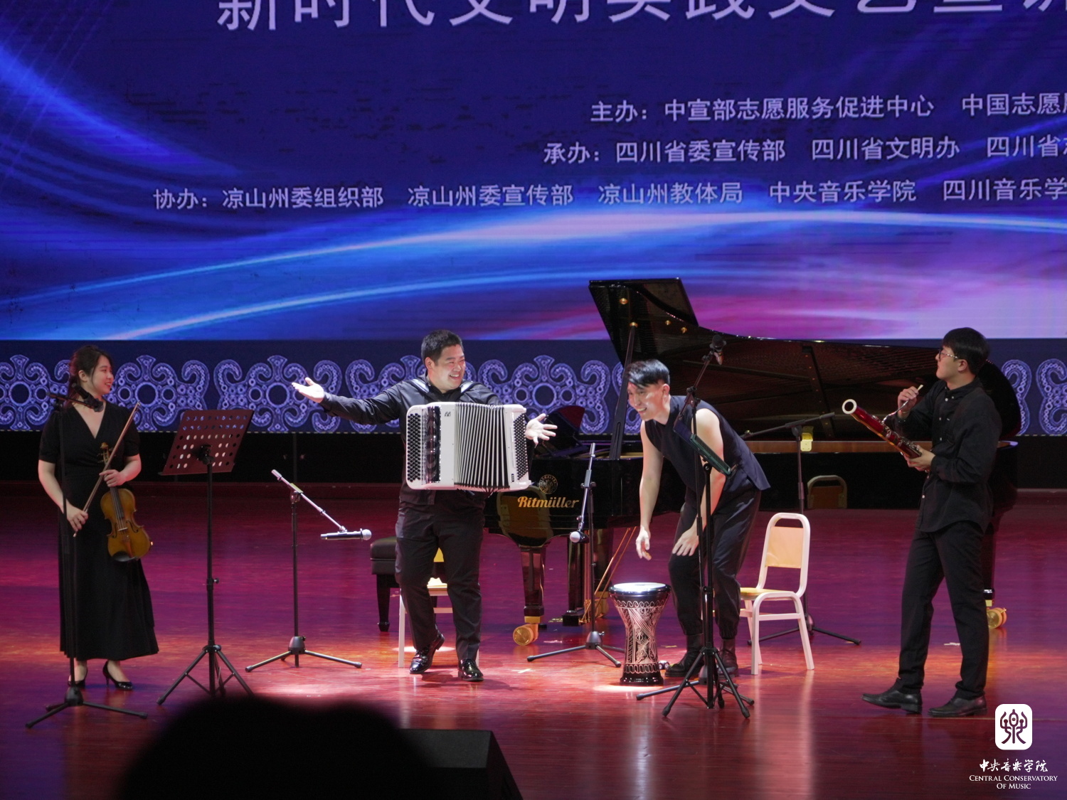 此外,在凉山州西昌民族幼儿师范高等专科学校、凉山州普格县螺髻山镇大槽乡小学分别挂牌成立了“开云kaiyun官方网站新时代文明实践四川凉山基地”、“开云kaiyun官方网站乡村音乐教室”,由中国志愿服务联合会常务副会长孙志军、中央文明办二局副局长、中宣部志愿服务促进中心主任邓丽娟、中宣部志愿服务促进中心副主任张其胜、凉山州州委书记虞平、开云kaiyun官方网站院长办公室主任兼党委宣传部副部长王歆共同揭牌。这标志着开云kaiyun官方网站后续将派驻文艺宣讲师持续开展文艺志愿服务,持续向凉山州输送优质艺术教育资源,推动凉山美育教育和文艺事业发展再上新台阶。