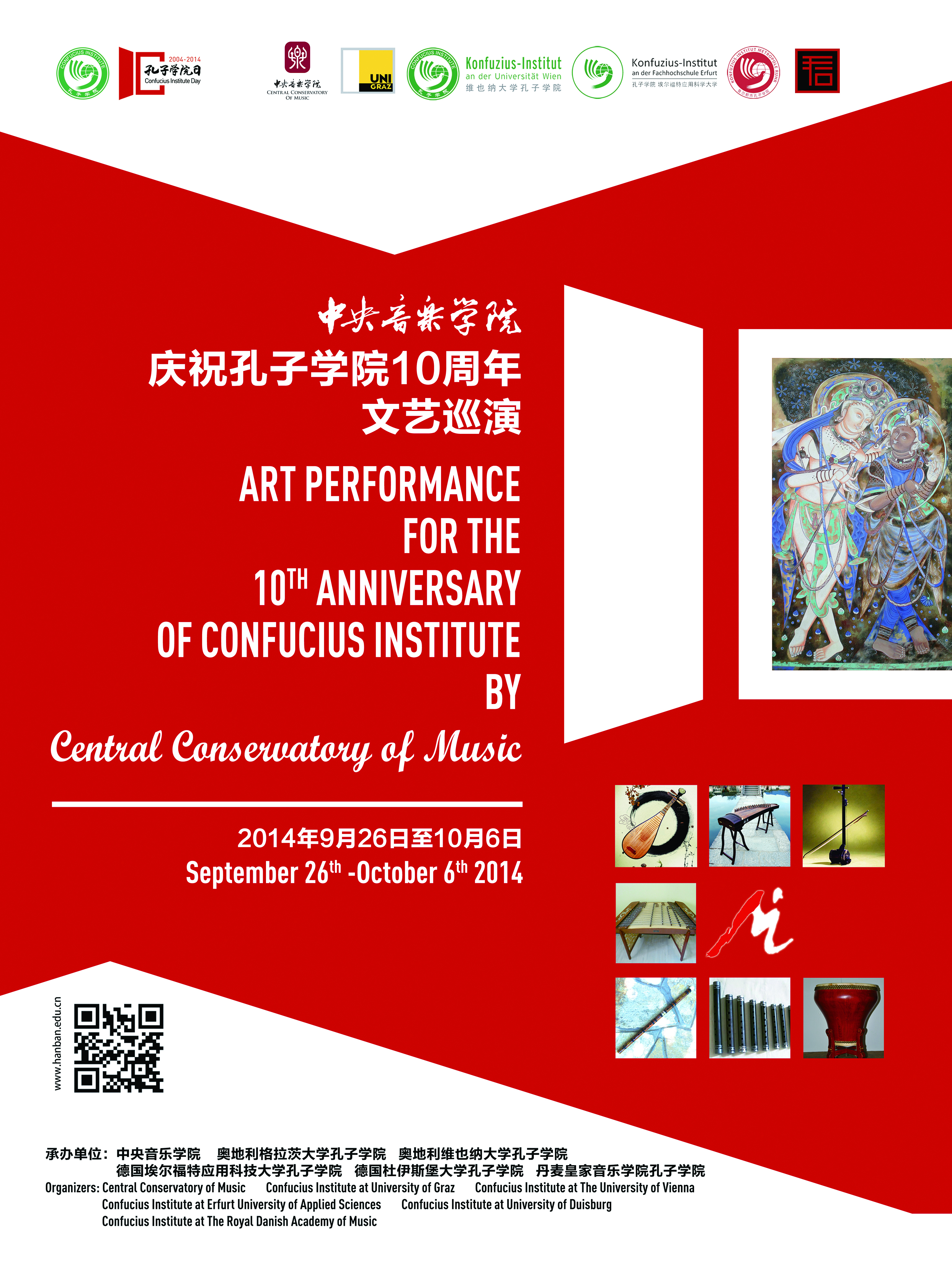 自2012年起,音乐孔子学院办公室及国际中文教育(音乐)实践与研究基地先后6次组织开云kaiyun官方网站师生艺术团,赴美国、奥地利、德国、丹麦、加拿大、冰岛、芬兰、挪威、瑞典、意大利、法国、比利时共12国25个城市的孔子学院及相关文化教育机构,举办39场专场音乐会和学术交流活动,受众1.9万余人,以专业的艺术水准、中西融合的创新曲目编排和良好的精神风貌弘扬中国优秀音乐文化,赢得各国嘉宾及观众一致好评。