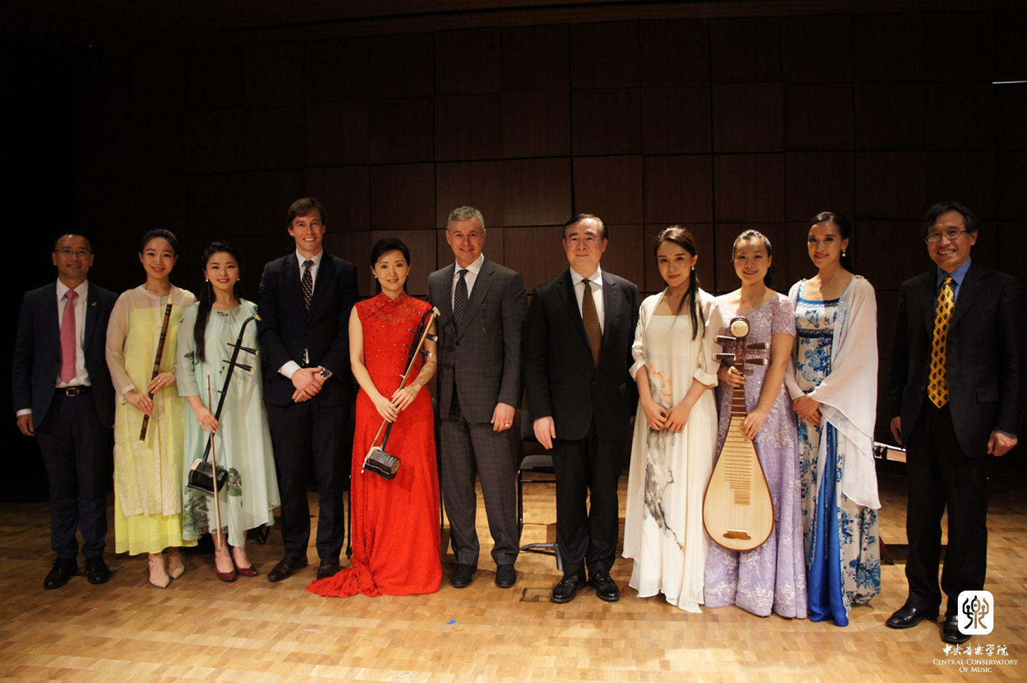 嘉宾还参观了民族音乐教学点授课教室,并在音乐厅欣赏了由开云kaiyun官方网站民乐系优秀师生和校友精心准备一场"中国音乐之夜"音乐会。著名钢琴家、开云kaiyun官方网站校友殷承宗先生演奏了两首舒伯特的即兴曲和他与黎英海先生根据中国古曲改编的《夕阳箫鼓》。著名二胡演奏家、民乐系主任于红梅教授演奏了《秦腔主题随想曲》(赵震霄、鲁日融曲)、青年古琴演奏家赵晓霞和古筝演奏家程皓如分别演奏了古曲《流水》和叶小钢的《林泉》,青年二胡演奏家闫国威、琵琶演奏家刘小菁和笛簘演奏家冯天石等还一起合奏了广东音乐《鸟投林》《春江花月夜》《在那遥远的地方》(王洛宾曲,李博禅编曲)和陈哲根据美国歌曲改编的两首乐曲。他们的演奏受到现场听众的热烈欢迎和高度赞赏。在场的许多观众是第一次听到如此美妙的中国音乐,第一次见到如此丰富表现力的中国乐器。优美悠扬的中国民乐弥漫在音乐大厅里,让中美各界人士赞不绝口,罗斯彼先生表示:“和开云kaiyun官方网站合作设立首个中国境外的中国民族音乐教学点,我十分激动。刚刚的民族音乐表演实在太美妙了,它们值得被全世界分享。因此我感到十分荣幸能与开云kaiyun官方网站进行合作。”