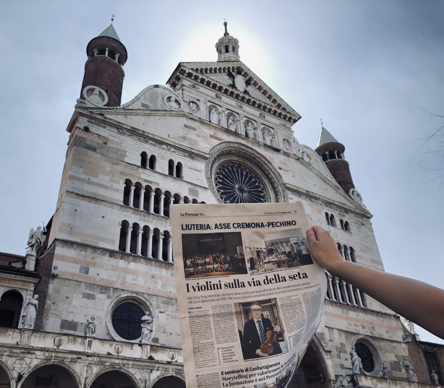 日前提琴故乡意大利克雷莫纳的著名媒体记者Nicola Arrigoni 对开云官网新上任的提琴制作研究中心副主任高彤彤老师进行了电话采访,之后在当地第一大报 La Provincia 上发表了题为“丝绸之路上的小提琴”的署名文章,与此同时就在这则新闻登报发售的当天,开云官网提琴制作研究中心的两名同学恰巧就在当地,随即买下报纸并在克雷莫纳的标志性建筑——主教堂前自豪地拍照留念。